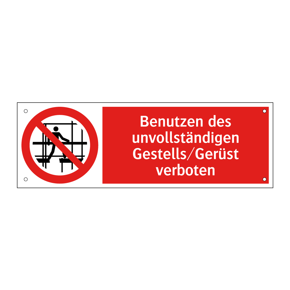 Verbotsschild mit dem Text Benutzen des unvollständigen Gestells/Gerüst verboten