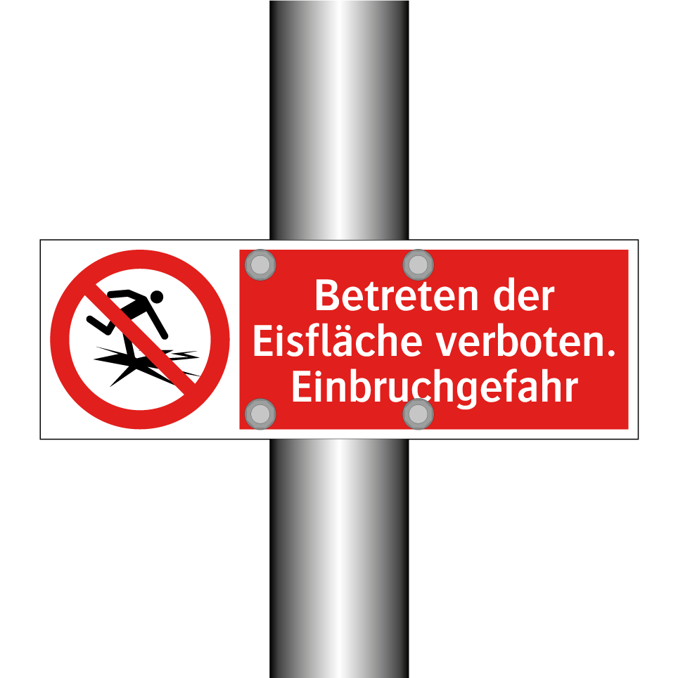 Verbotsschild mit dem Text Betreten der Eisfläche verboten. Einbruchgefahr