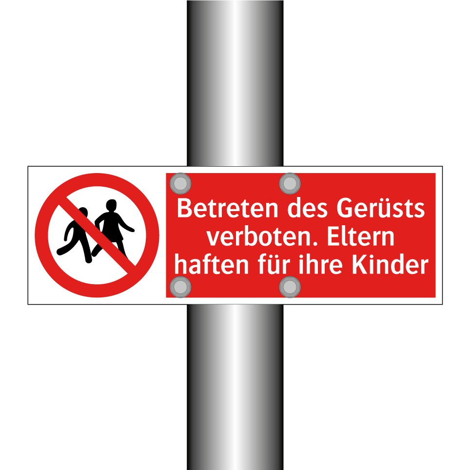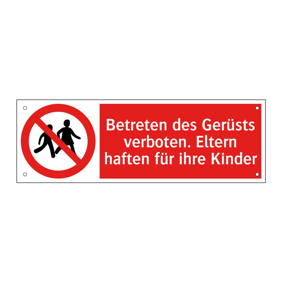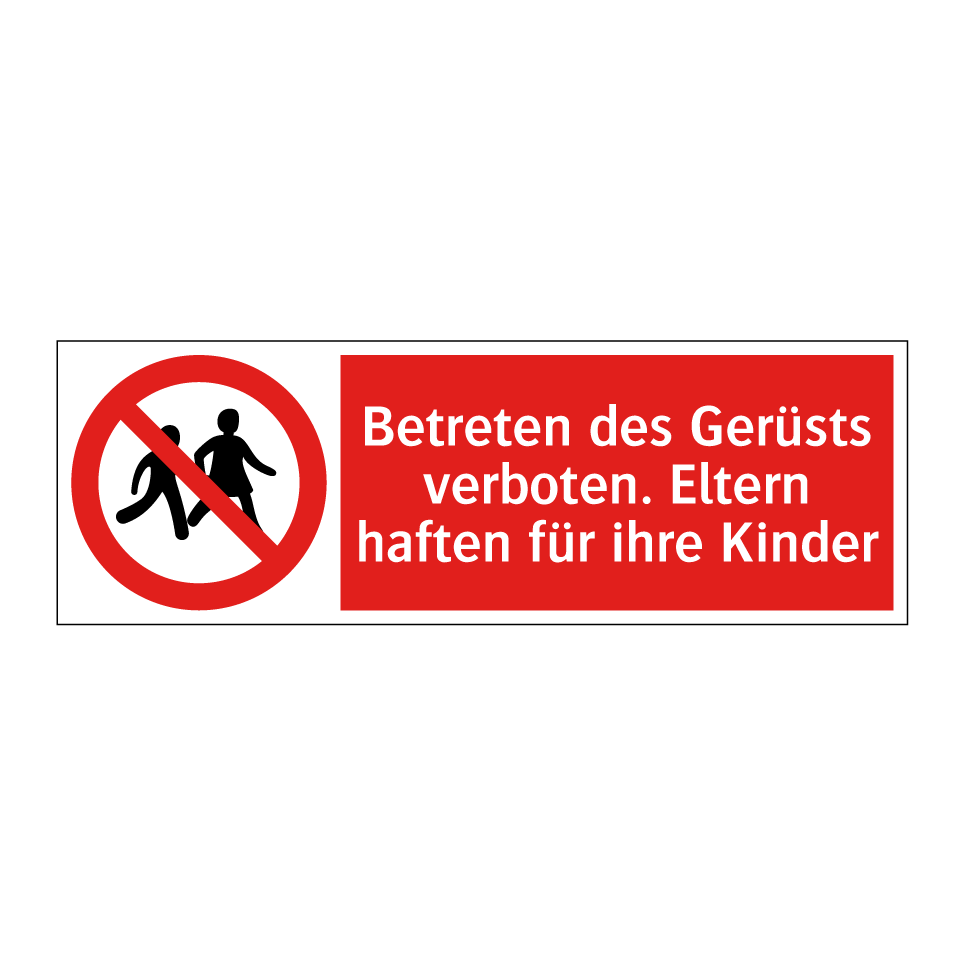 Verbotsschild mit dem Text Betreten des Gerüsts verboten. Eltern haften für ihre Kinder