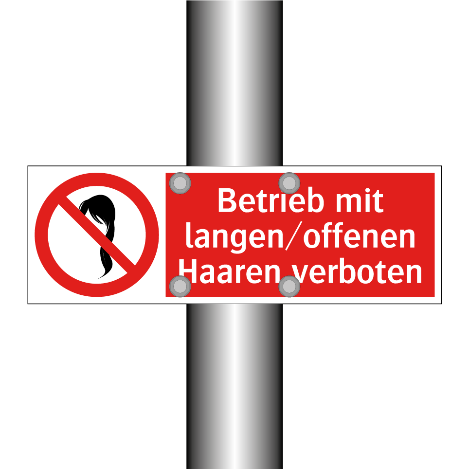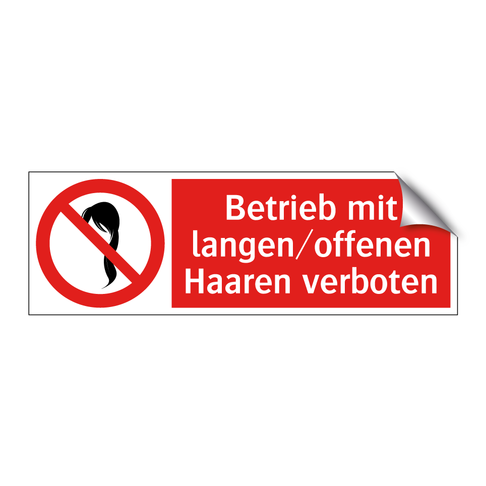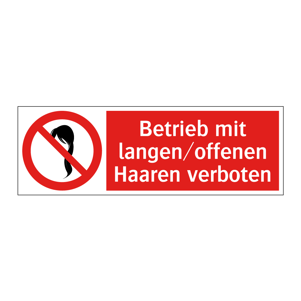 Verbotsschild mit dem Text Betrieb mit langen/offenen Haaren verboten