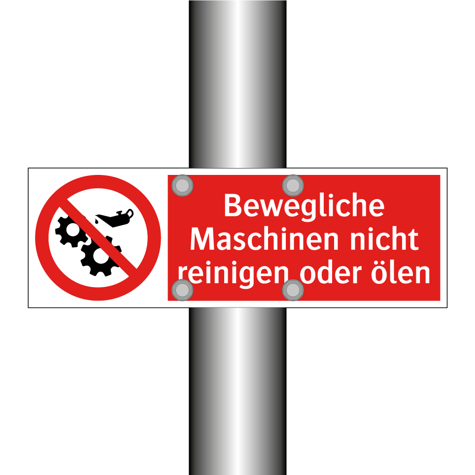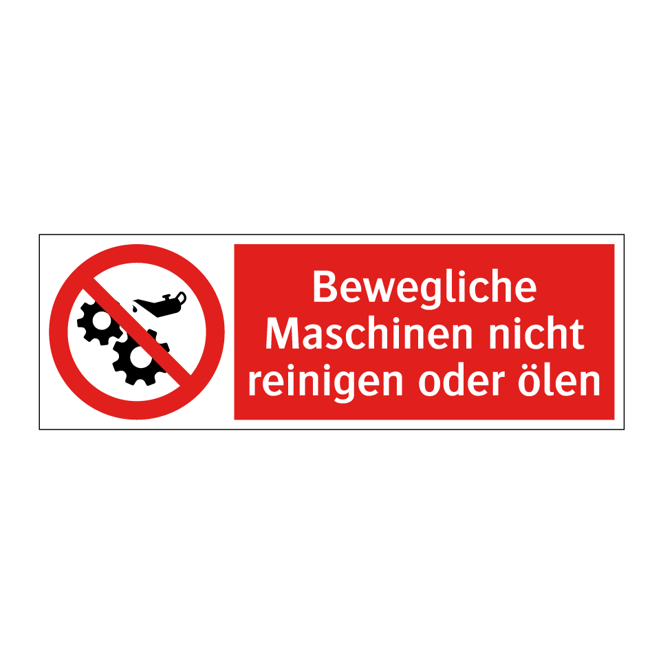 Verbotsschild mit dem Text Bewegliche Maschinen nicht reinigen oder ölen