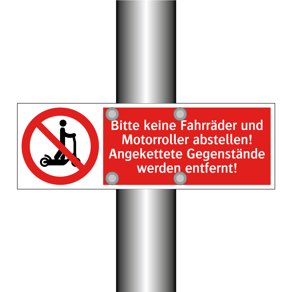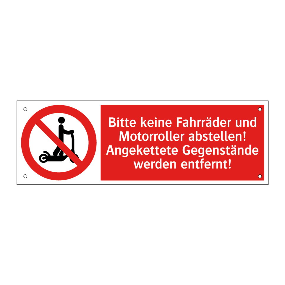 Verbotsschild mit dem Text Bitte keine Fahrräder und Motorroller abstellen! Angekettete Gegenstände werden entfernt!