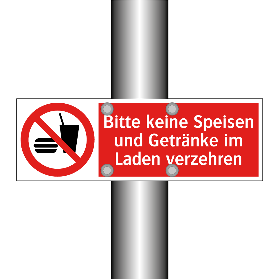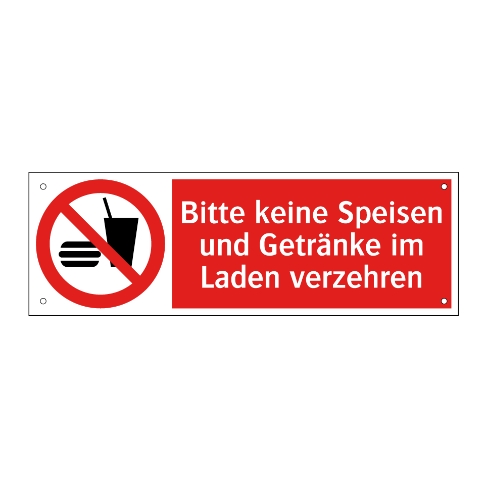 Verbotsschild mit dem Text Bitte keine Speisen und Getränke im Laden verzehren