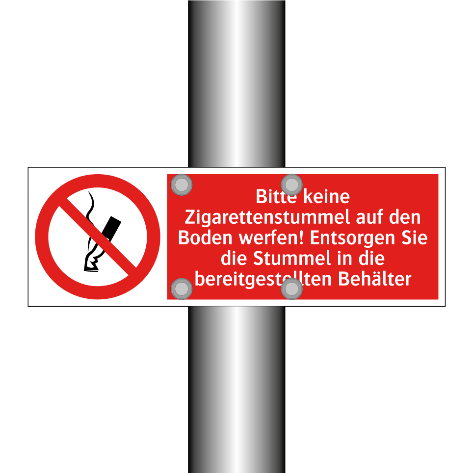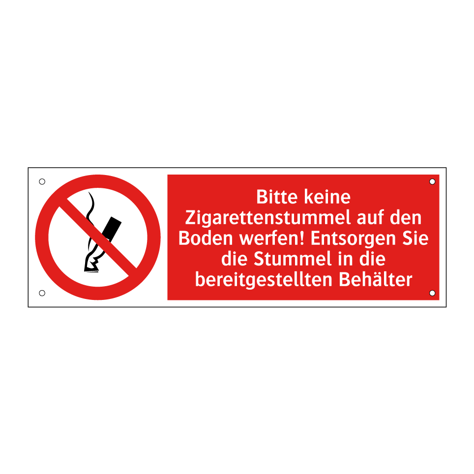 Verbotsschild mit dem Text Bitte keine Zigarettenstummel auf den Boden werfen! Entsorgen Sie die Stummel in die bereitgestellten Behälter