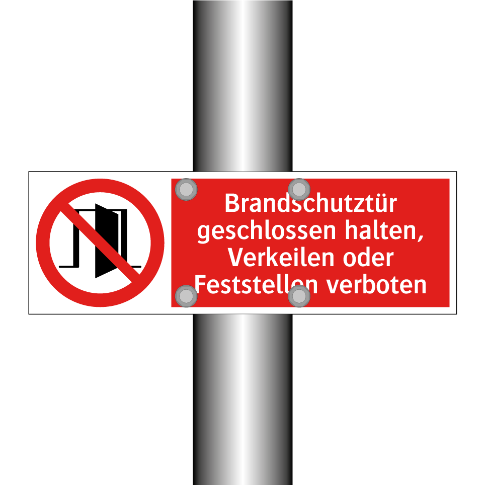 Verbotsschild mit dem Text Brandschutztür geschlossen halten, Verkeilen oder Feststellen verboten