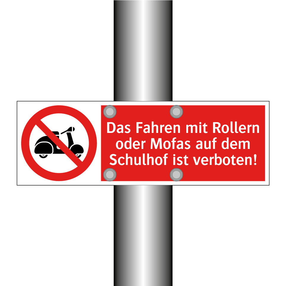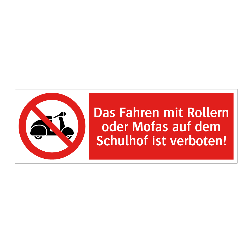 Verbotsschild mit dem Text Das Fahren mit Rollern oder Mofas auf dem Schulhof ist verboten!