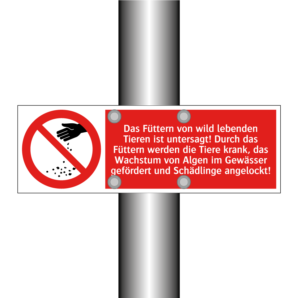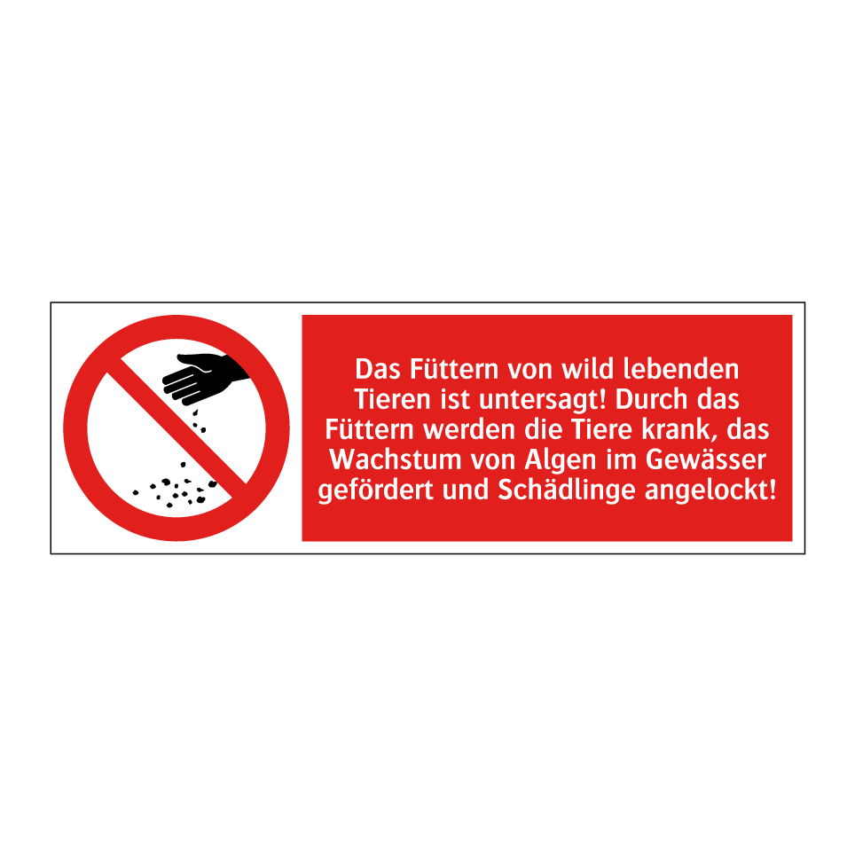 Verbotsschild mit dem Text Das Füttern von wild lebenden Tieren ist untersagt! Durch das Füttern werden die Tiere krank, das Wachstum von Algen im Gewässer gefördert und Schädlinge angelockt!