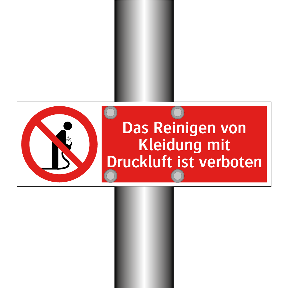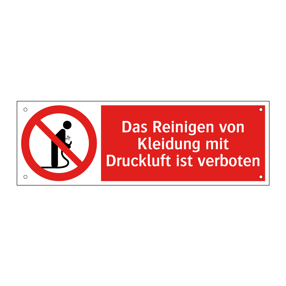 Verbotsschild mit dem Text Das Reinigen von Kleidung mit Druckluft ist verboten