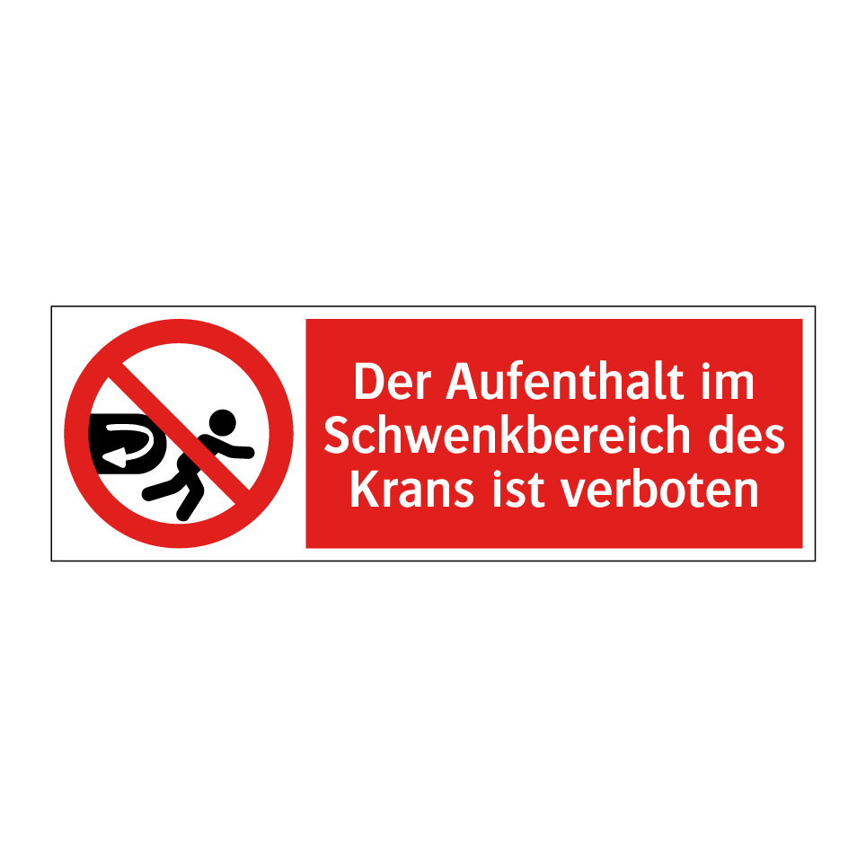 Verbotsschild mit dem Text Der Aufenthalt im Schwenkbereich des Krans ist verboten