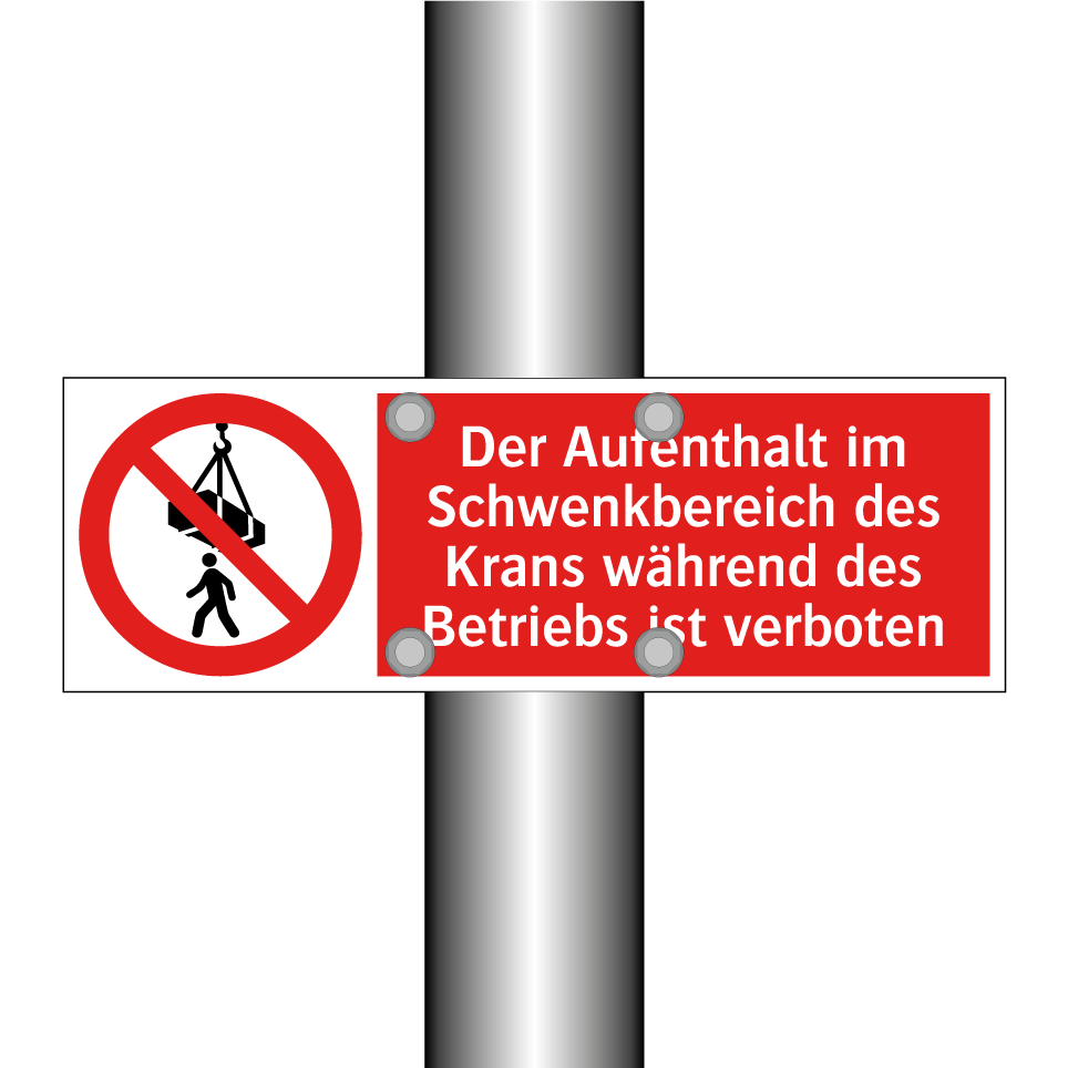 Verbotsschild mit dem Text Der Aufenthalt im Schwenkbereich des Krans während des Betriebs ist verboten