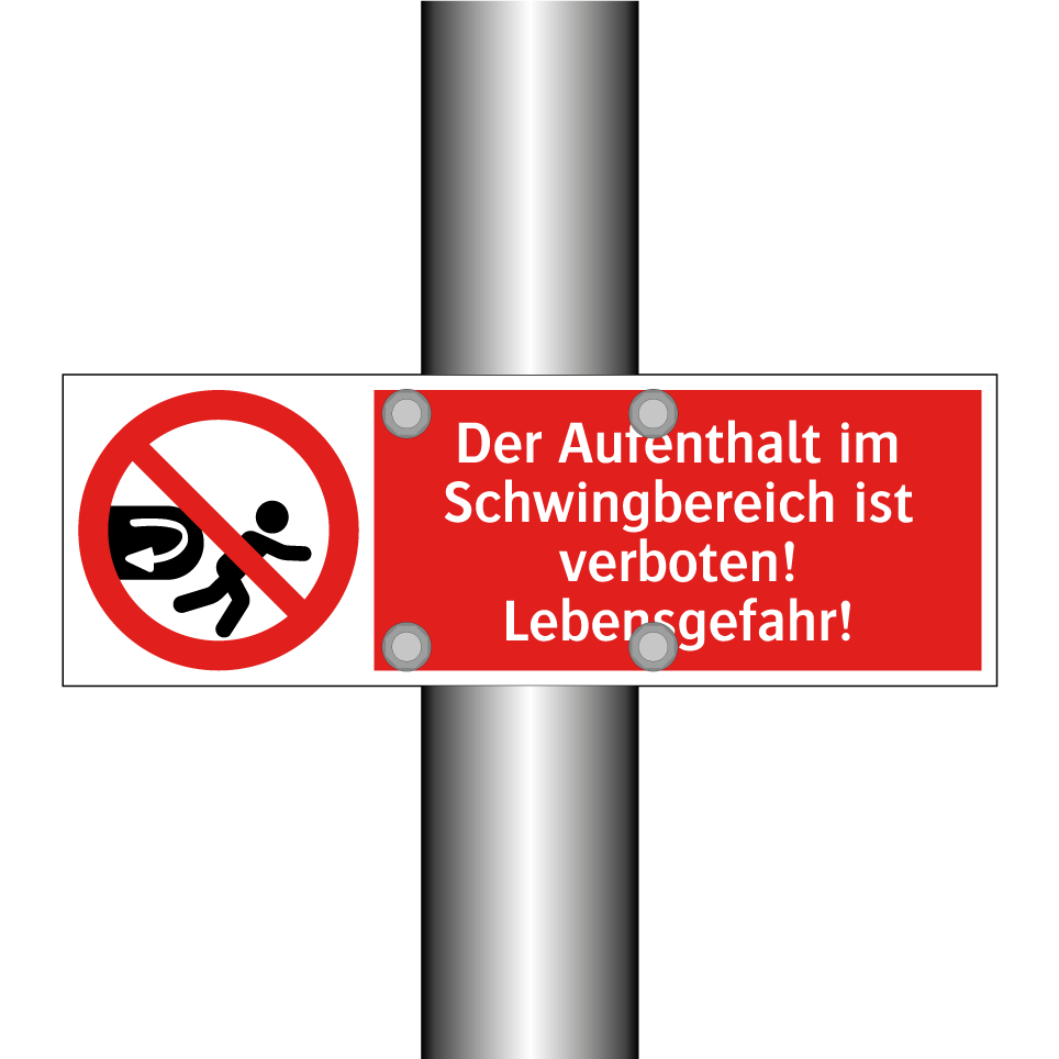 Verbotsschild mit dem Text Der Aufenthalt im Schwingbereich ist verboten! Lebensgefahr!