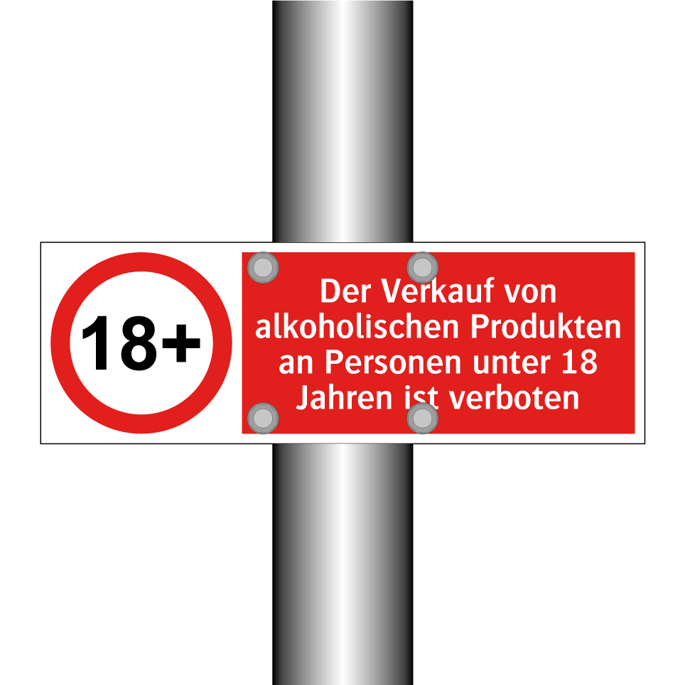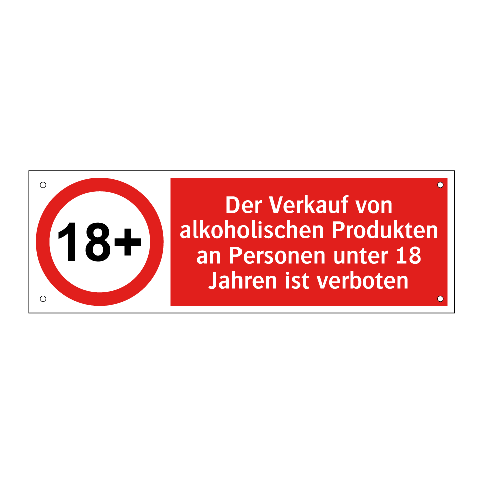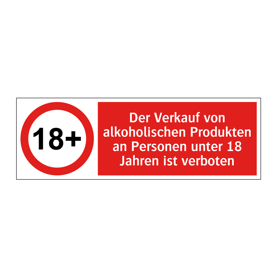 Verbotsschild mit dem Text Der Verkauf von alkoholischen Produkten an Personen unter 18 Jahren ist verboten