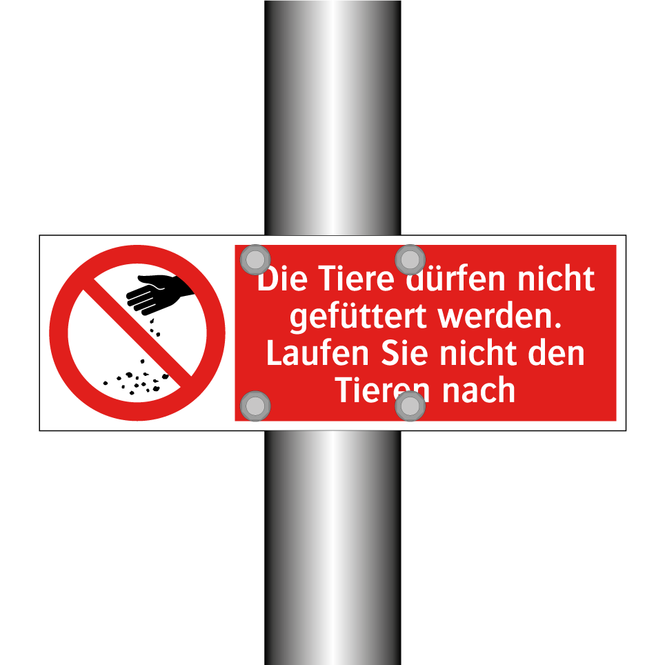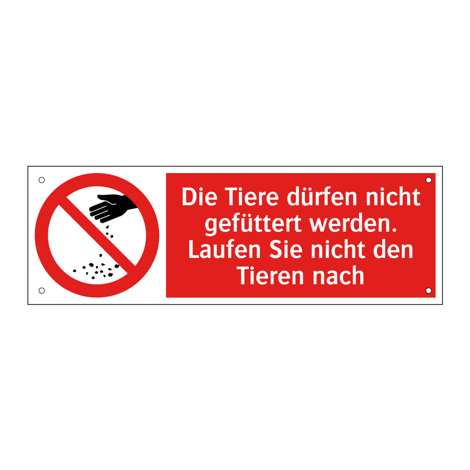 Verbotsschild mit dem Text Die Tiere dürfen nicht gefüttert werden. Laufen Sie nicht den Tieren nach