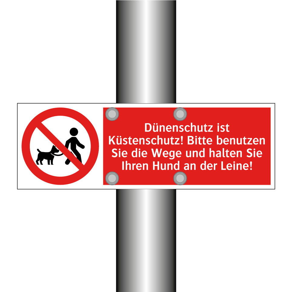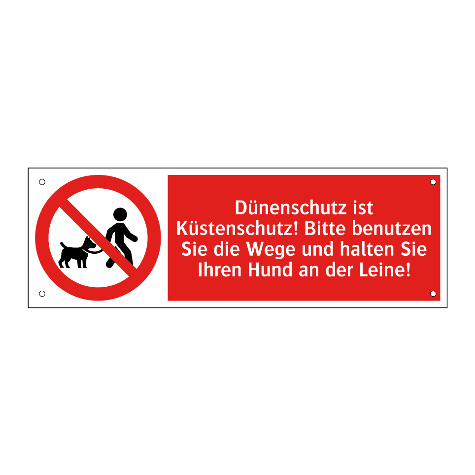 Verbotsschild mit dem Text Dünenschutz ist Küstenschutz! Bitte benutzen Sie die Wege und halten Sie Ihren Hund an der Leine!