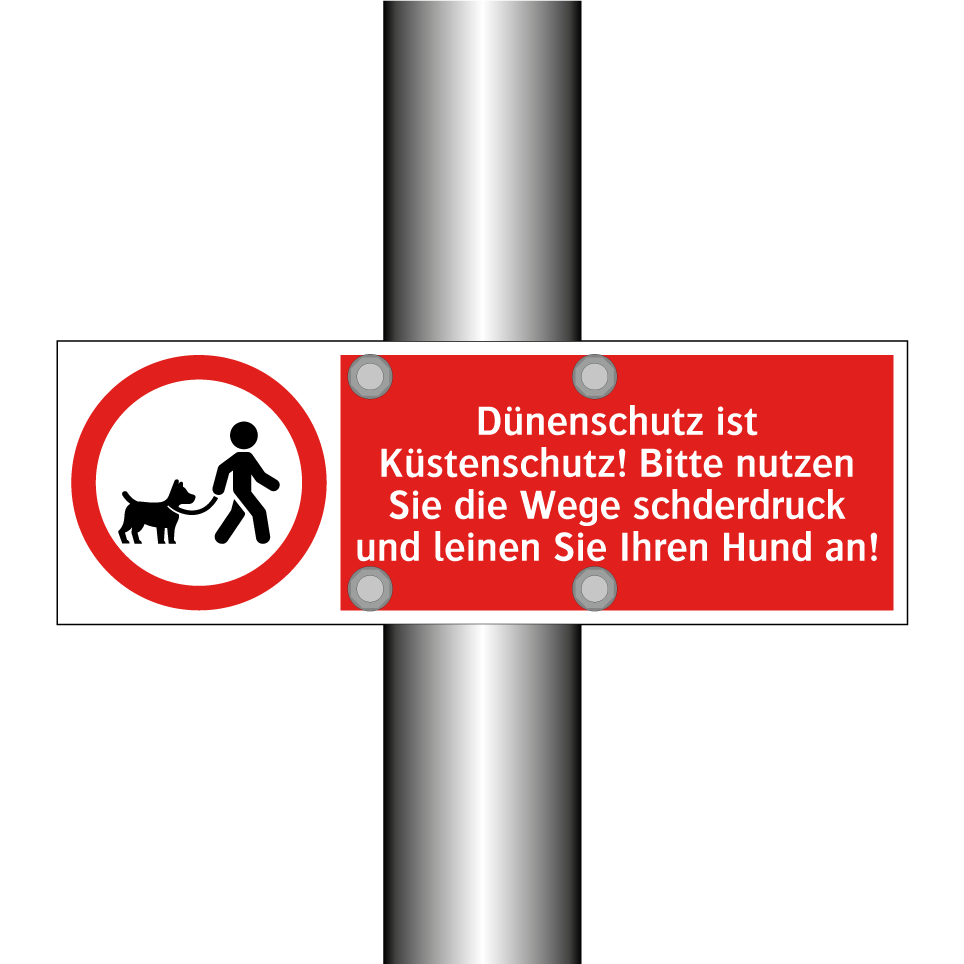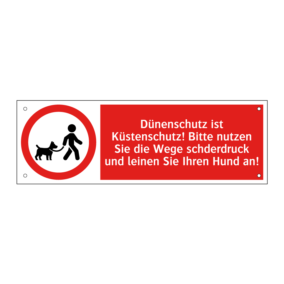 Verbotsschild mit dem Text Dünenschutz ist Küstenschutz! Bitte nutzen Sie die Wege schderdruck und leinen Sie Ihren Hund an!