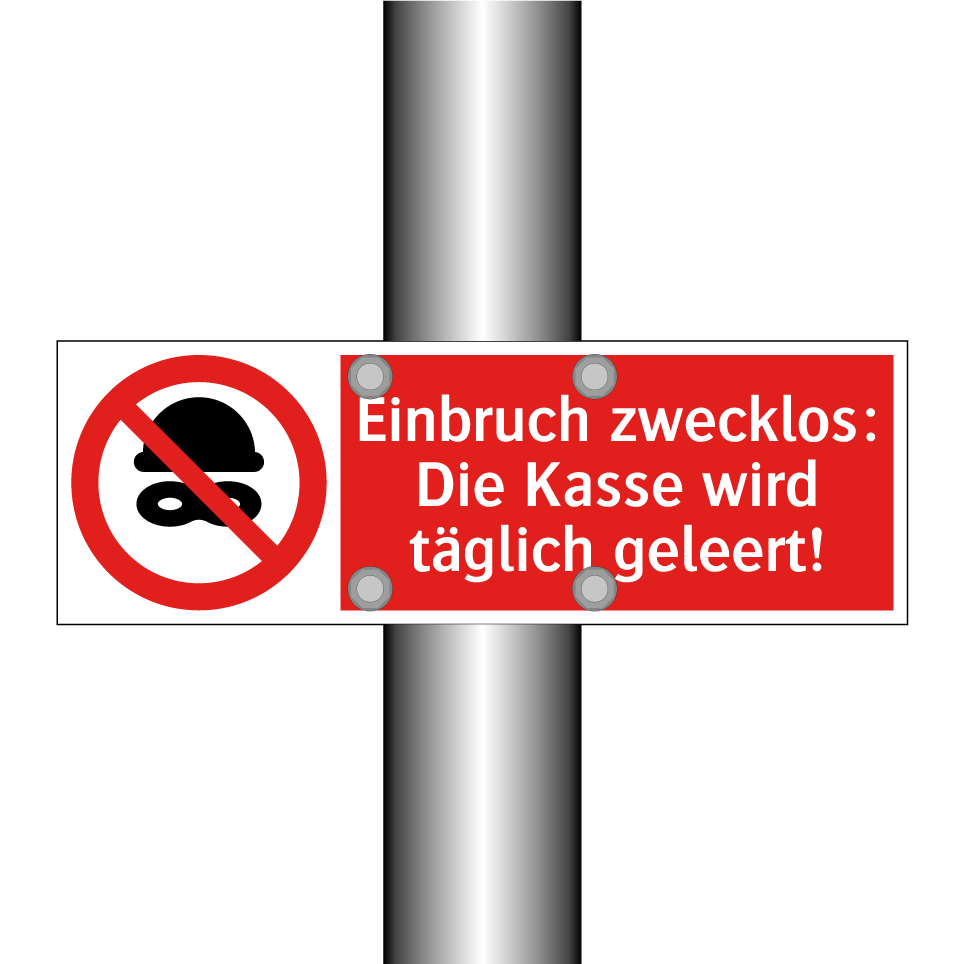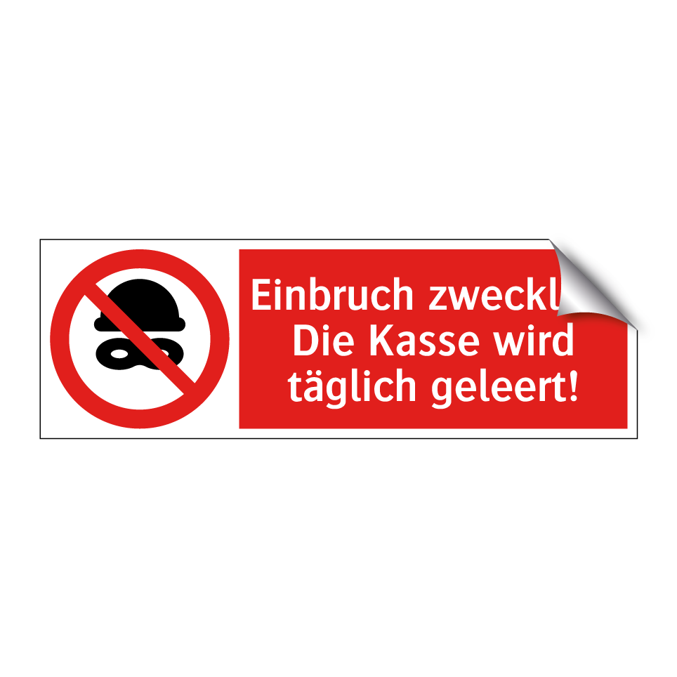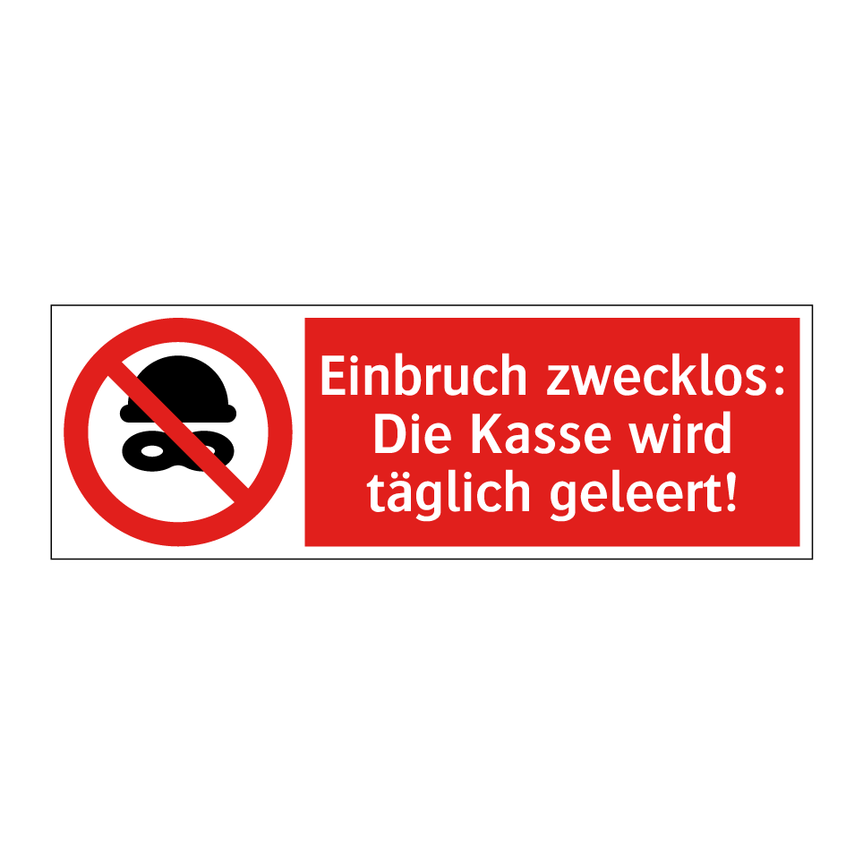 Verbotsschild mit dem Text Einbruch zwecklos: Die Kasse wird täglich geleert!