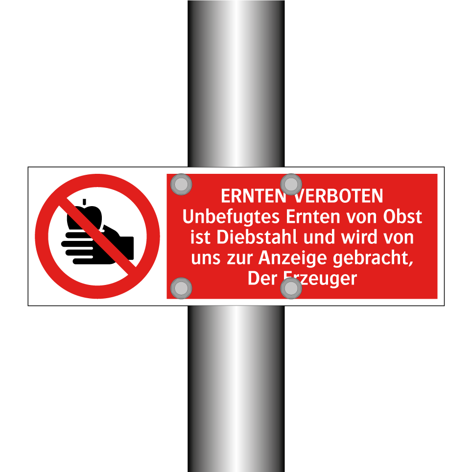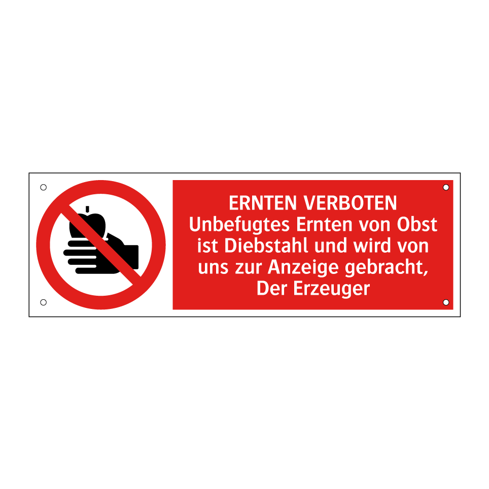 Verbotsschild mit dem Text ERNTEN VERBOTEN Unbefugtes Ernten von Obst ist Diebstahl und wird von uns zur Anzeige gebracht, Der Erzeuger