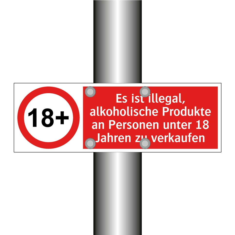 Verbotsschild mit dem Text Es ist illegal, alkoholische Produkte an Personen unter 18 Jahren zu verkaufen