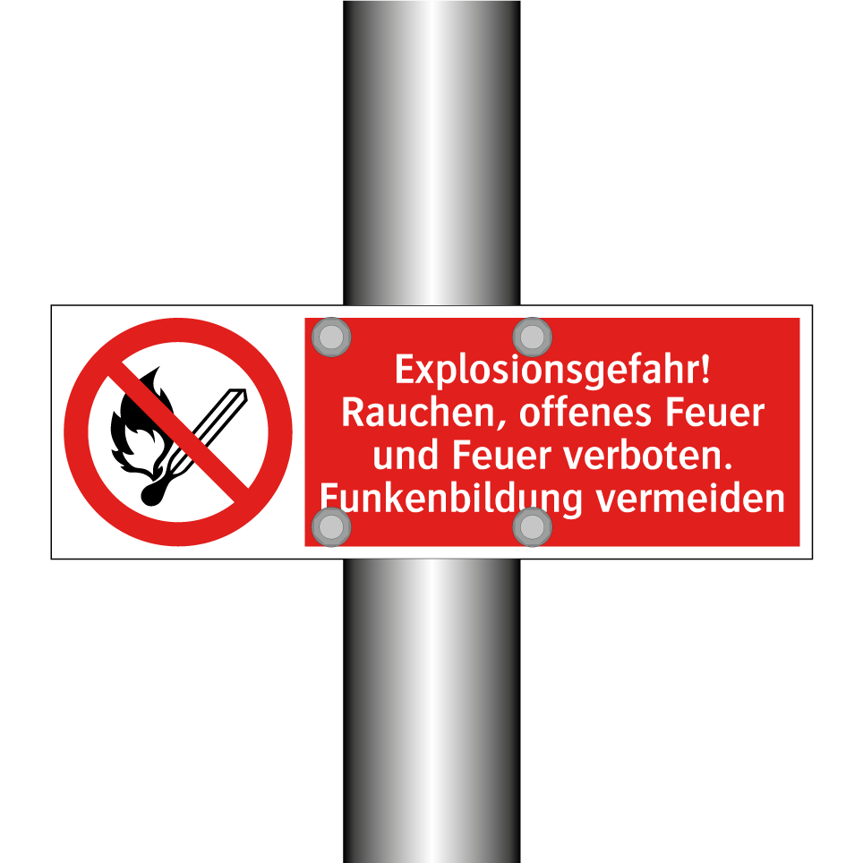 Verbotsschild mit dem Text Explosionsgefahr! Rauchen, offenes Feuer und Feuer verboten. Funkenbildung vermeiden