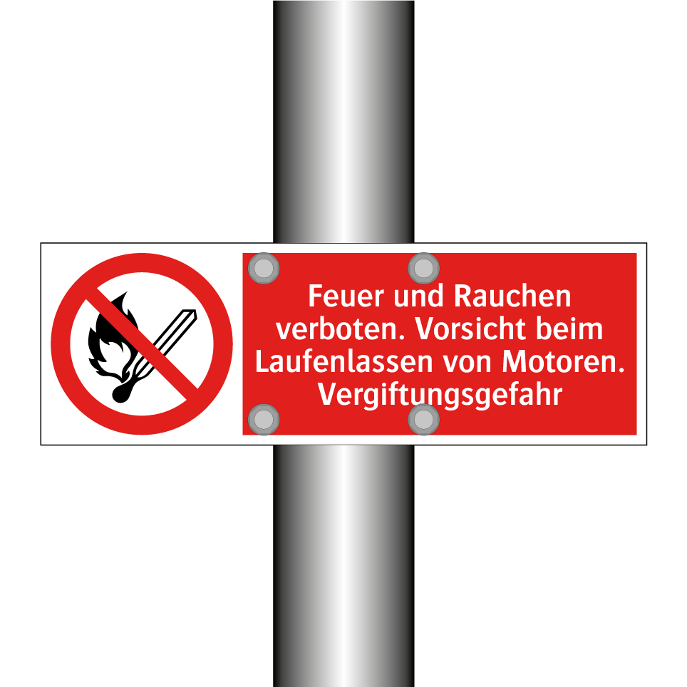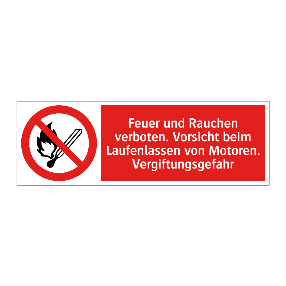 Verbotsschild mit dem Text Feuer und Rauchen verboten. Vorsicht beim Laufenlassen von Motoren. Vergiftungsgefahr