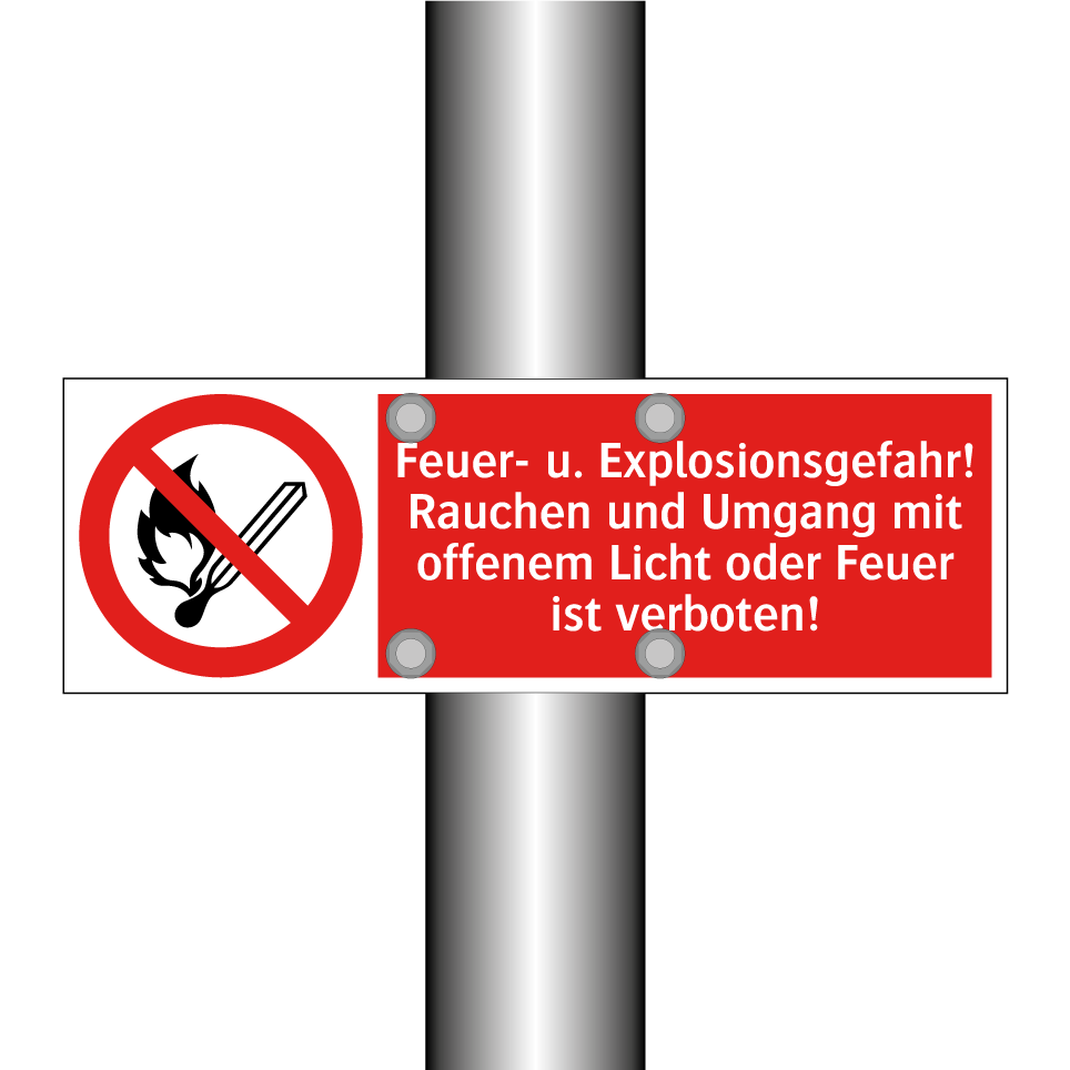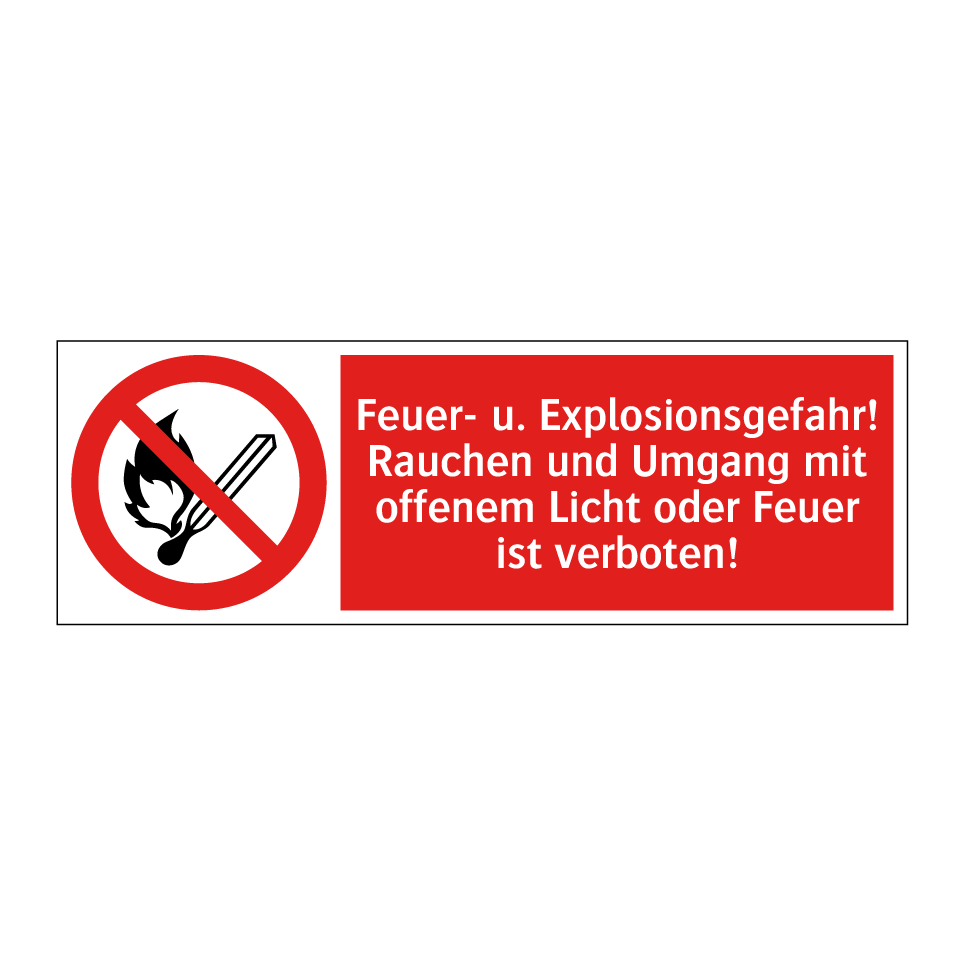 Verbotsschild mit dem Text Feuer- u. Explosionsgefahr! Rauchen und Umgang mit offenem Licht oder Feuer ist verboten!