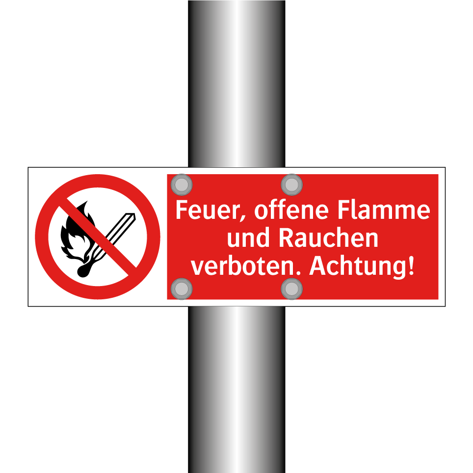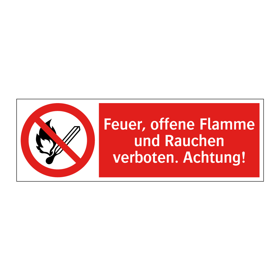 Verbotsschild mit dem Text Feuer, offene Flamme und Rauchen verboten. Achtung!
