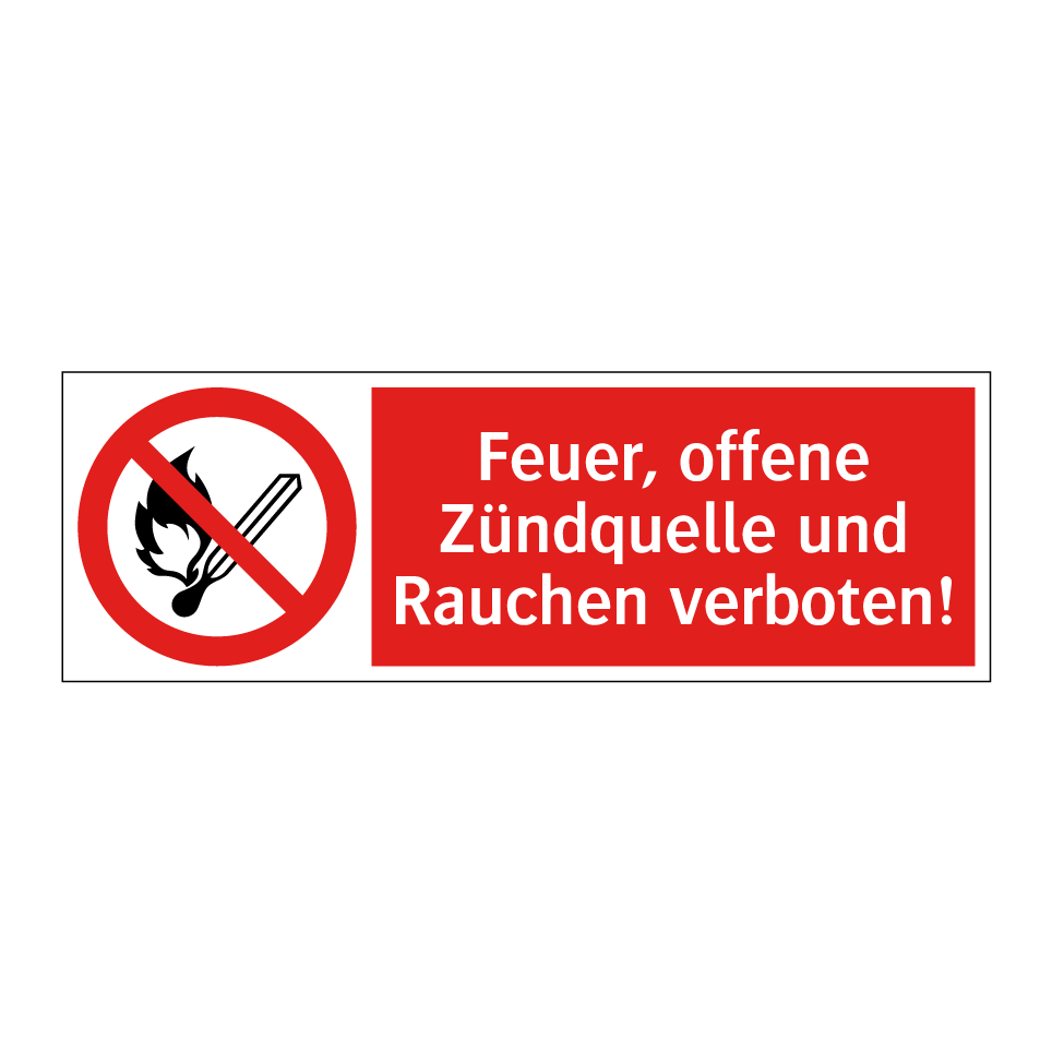 Verbotsschild mit dem Text Feuer, offene Zündquelle und Rauchen verboten!