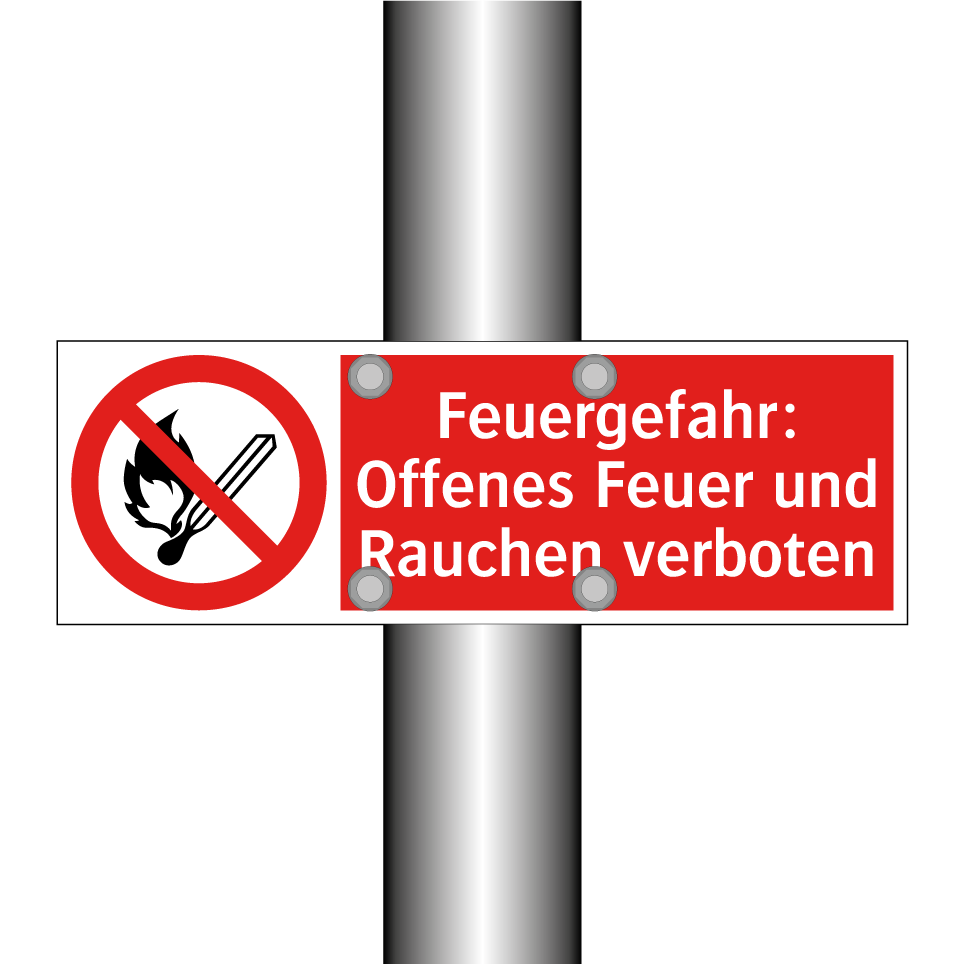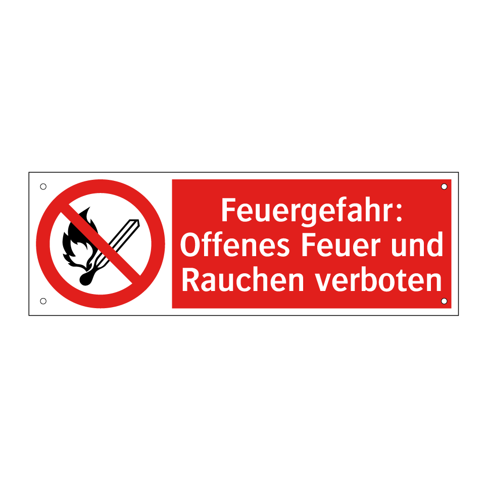 Verbotsschild mit dem Text Feuergefahr: Offenes Feuer und Rauchen verboten