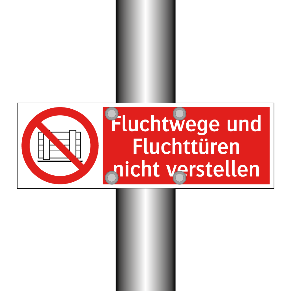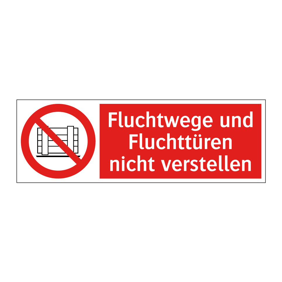 Verbotsschild mit dem Text Fluchtwege und Fluchttüren nicht verstellen