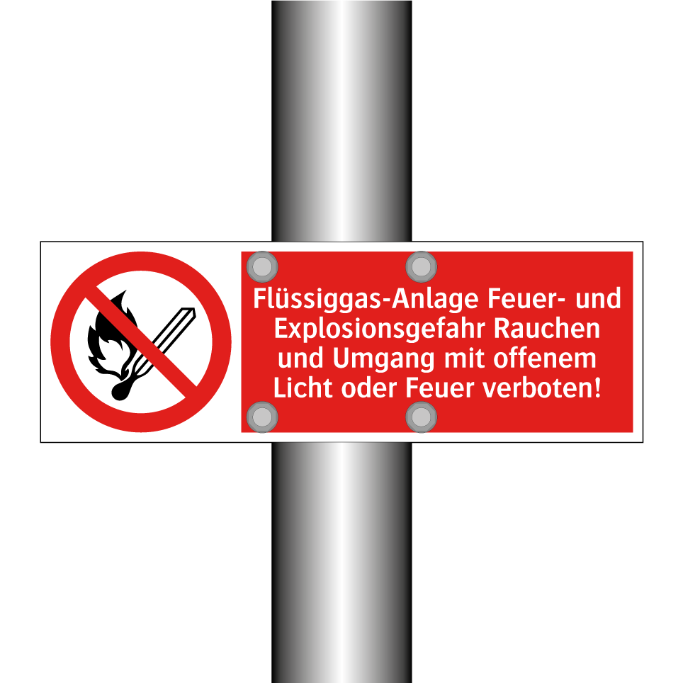 Verbotsschild mit dem Text Flüssiggas-Anlage Feuer- und Explosionsgefahr Rauchen und Umgang mit offenem Licht oder Feuer verboten!
