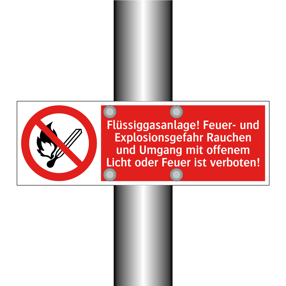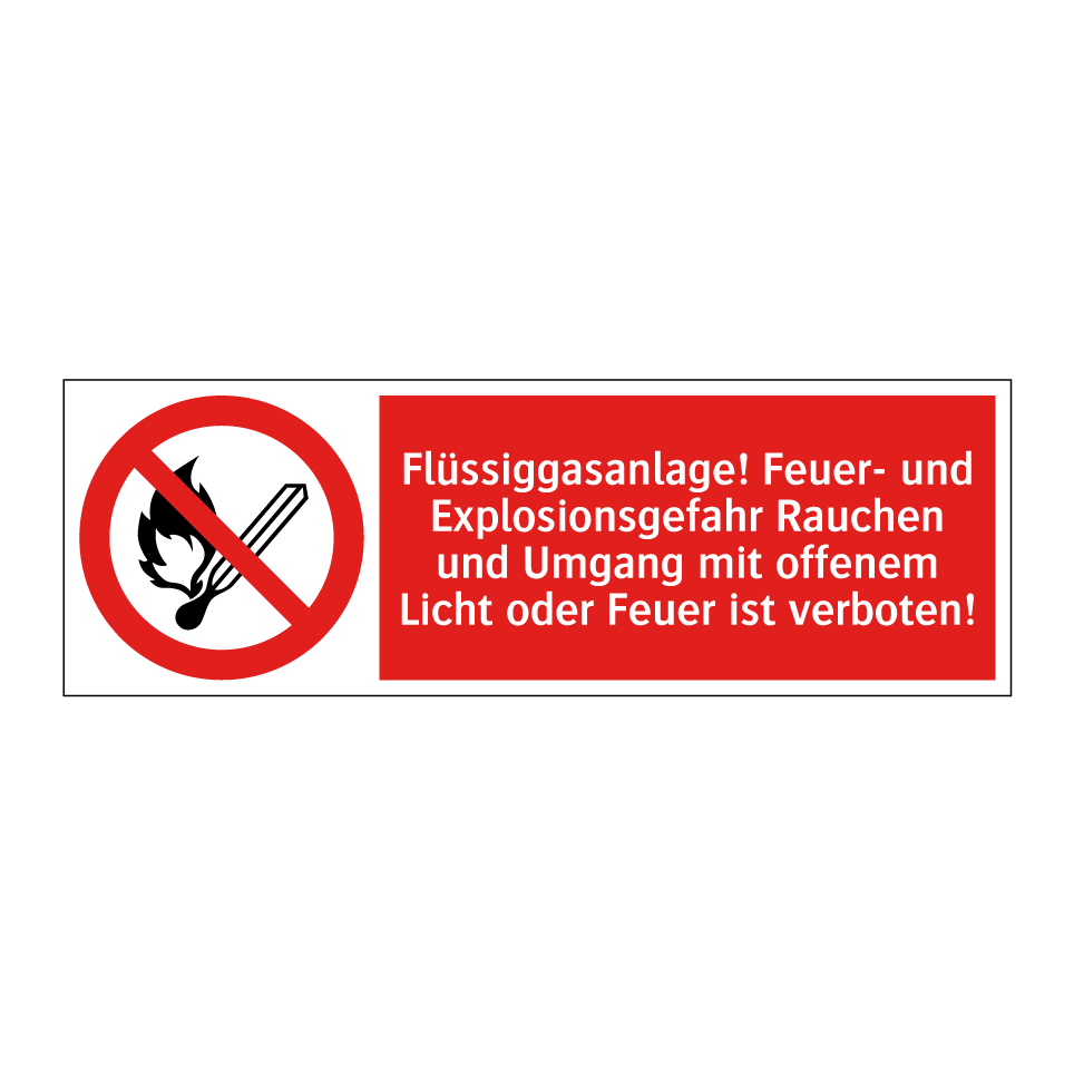 Verbotsschild mit dem Text Flüssiggasanlage! Feuer- und Explosionsgefahr Rauchen und Umgang mit offenem Licht oder Feuer ist verboten!