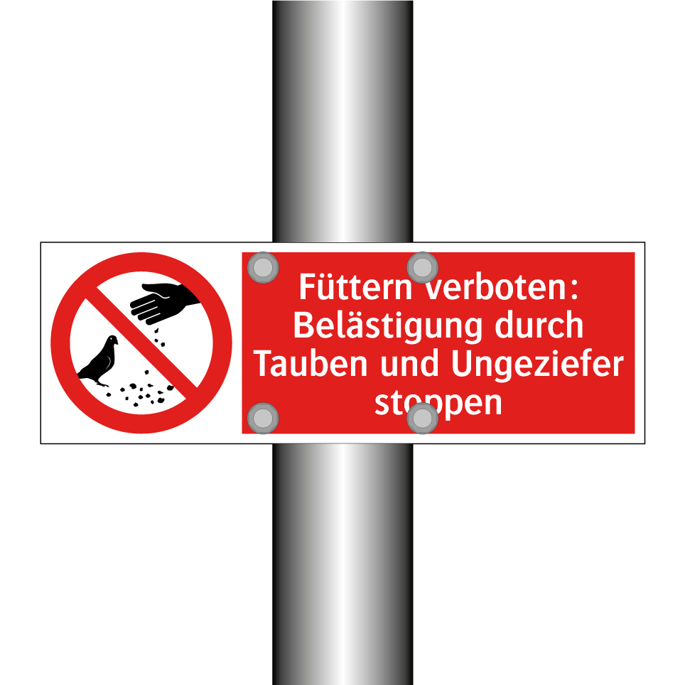 Verbotsschild mit dem Text Füttern verboten: Belästigung durch Tauben und Ungeziefer stoppen