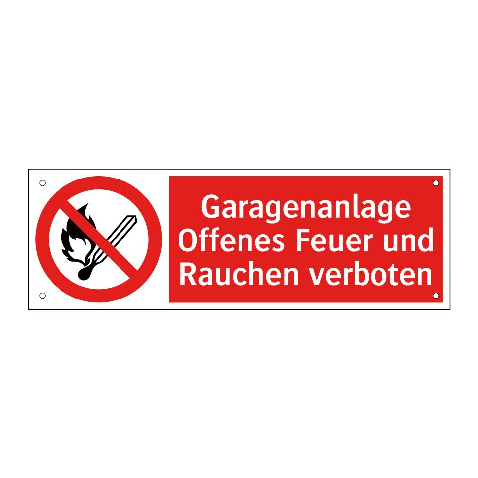 Verbotsschild mit dem Text Garagenanlage Offenes Feuer und Rauchen verboten