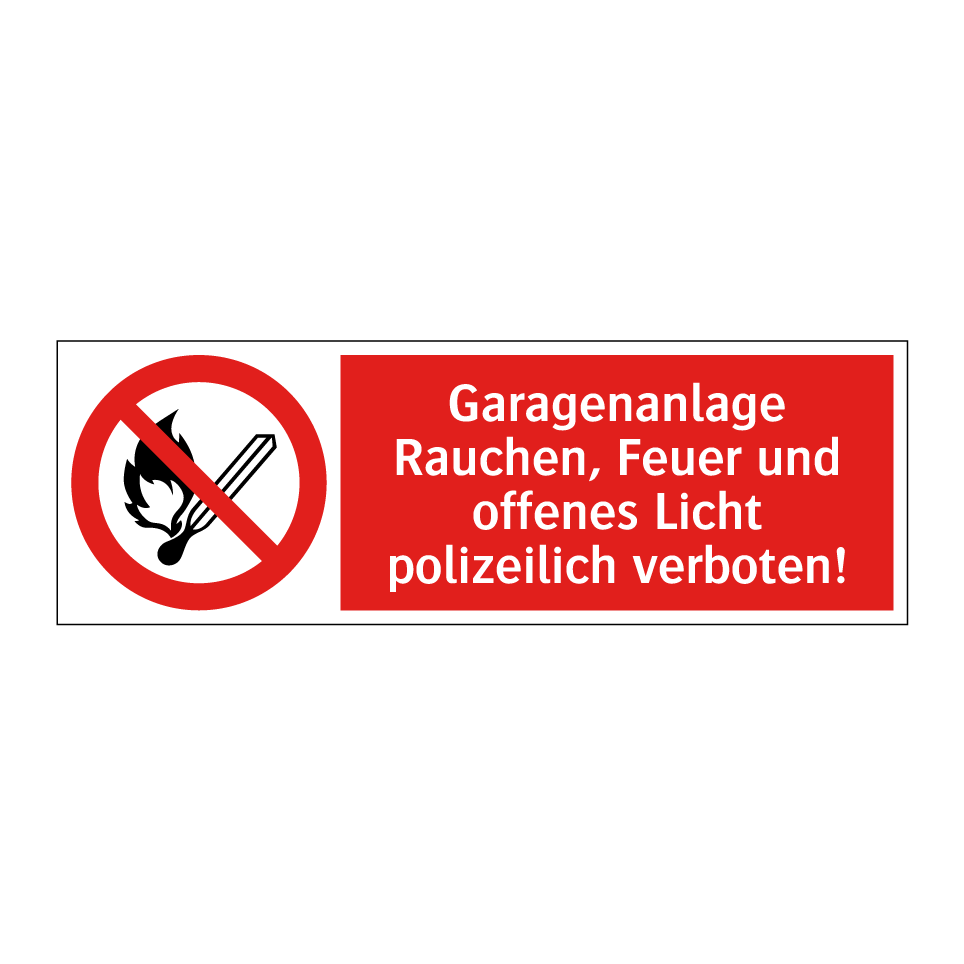 Verbotsschild mit dem Text Garagenanlage Rauchen, Feuer und offenes Licht polizeilich verboten!