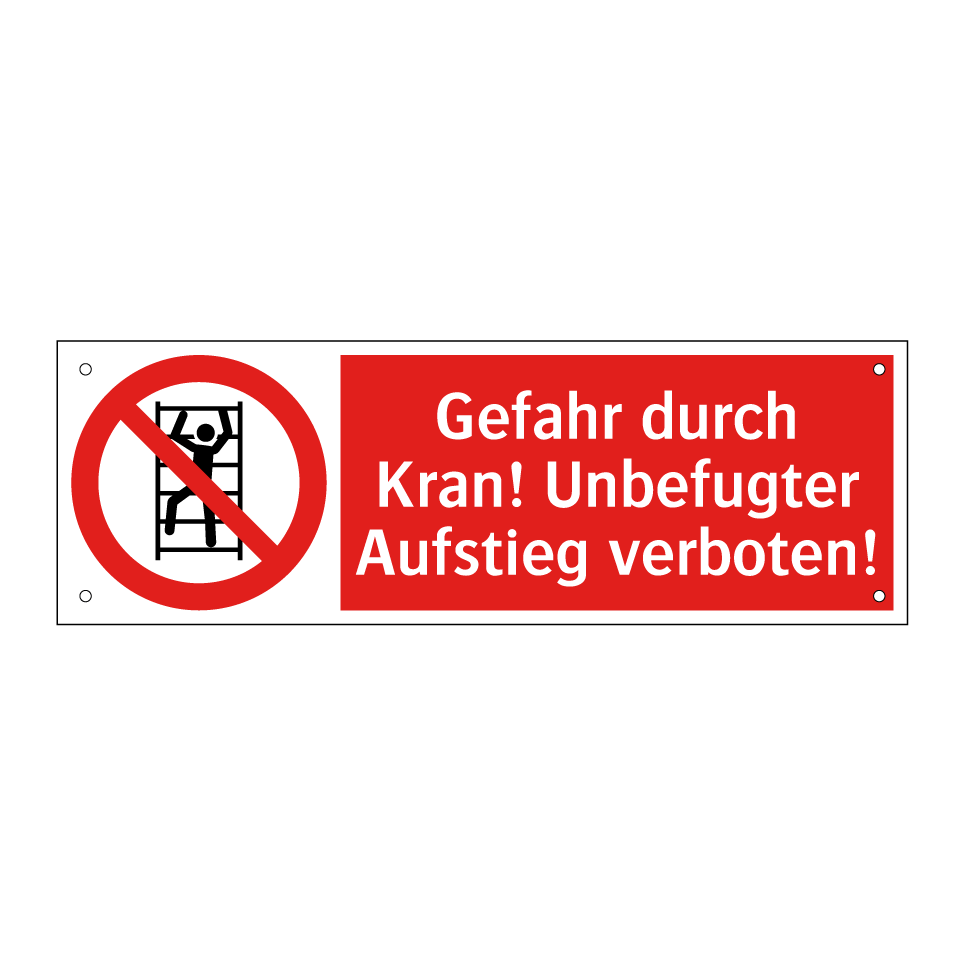 Verbotsschild mit dem Text Gefahr durch Kran! Unbefugter Aufstieg verboten!