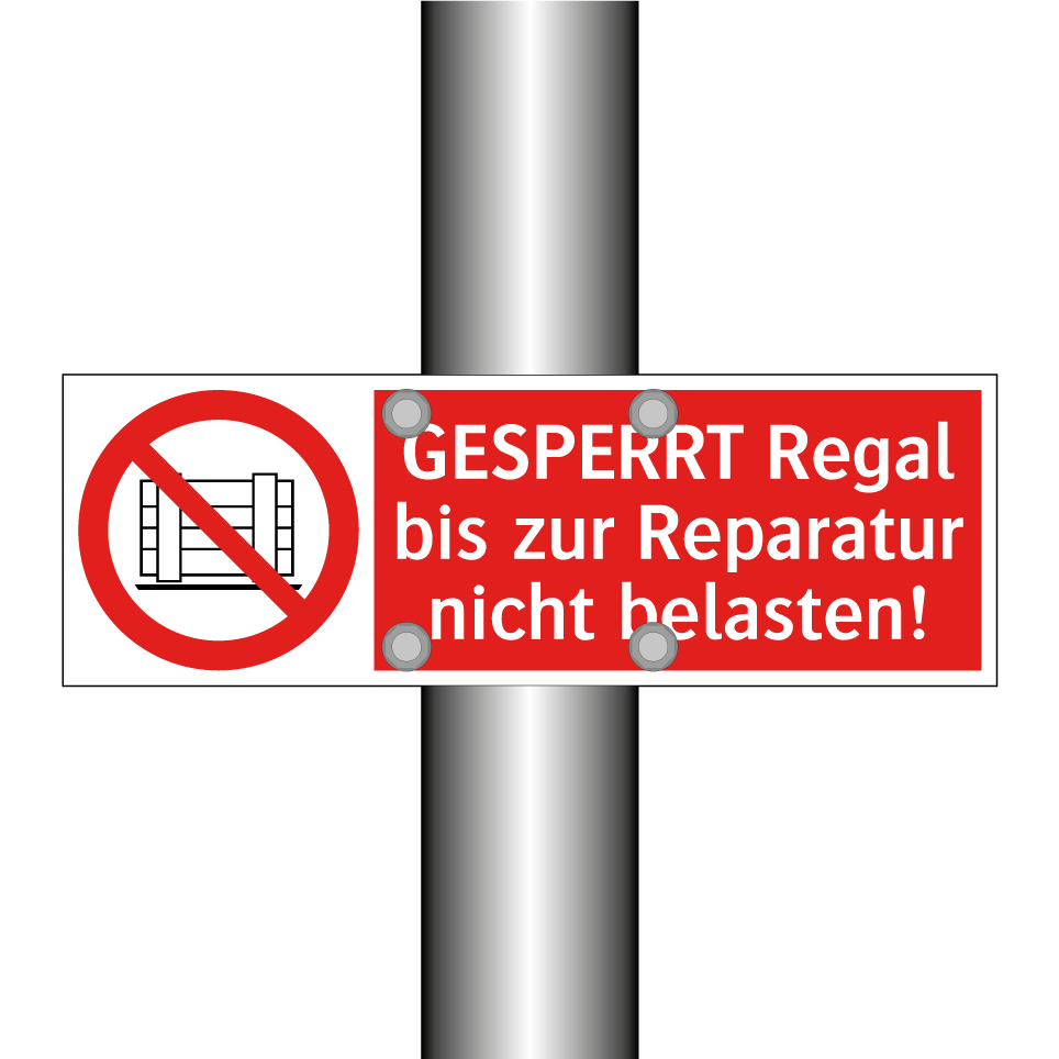 Verbotsschild mit dem Text GESPERRT Regal bis zur Reparatur nicht belasten!
