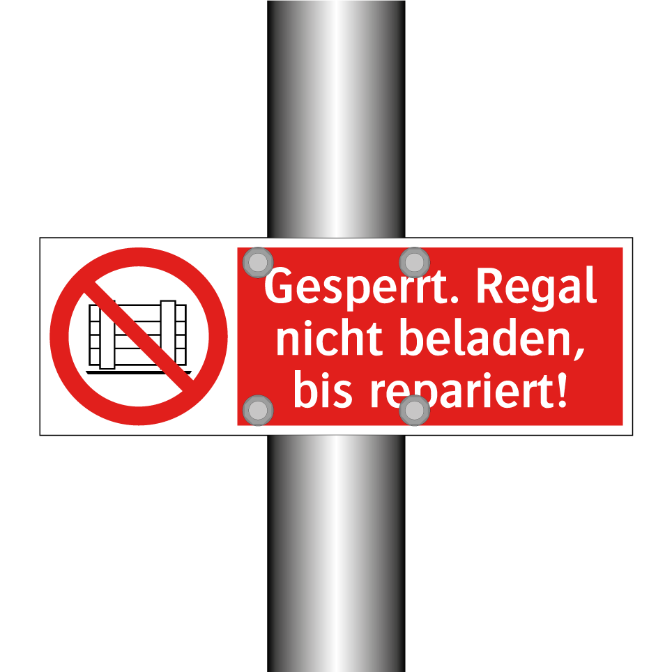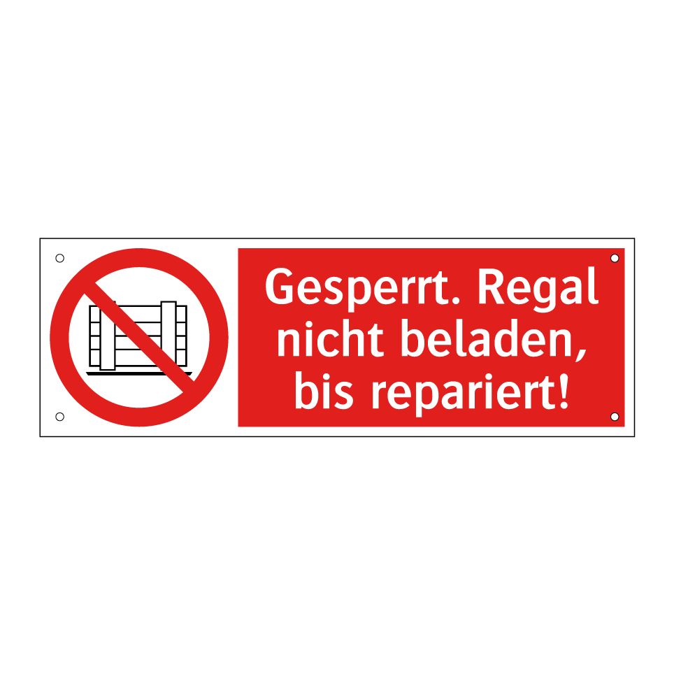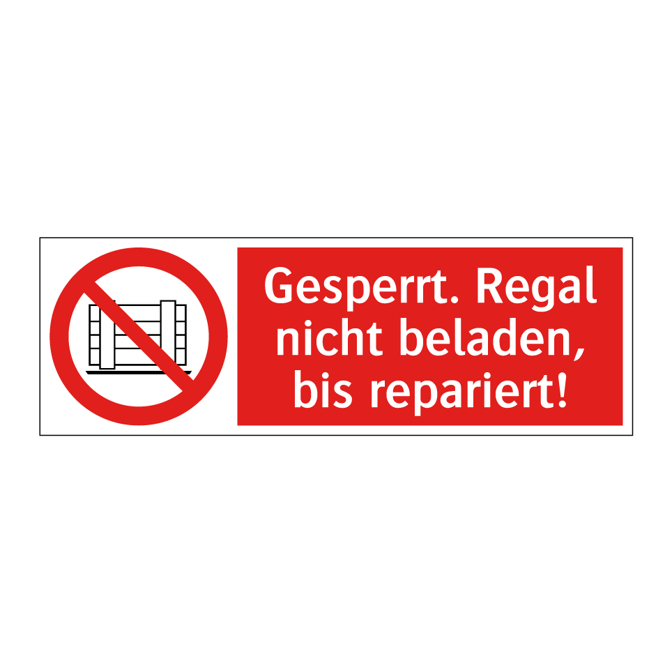 Verbotsschild mit dem Text Gesperrt. Regal nicht beladen, bis repariert!