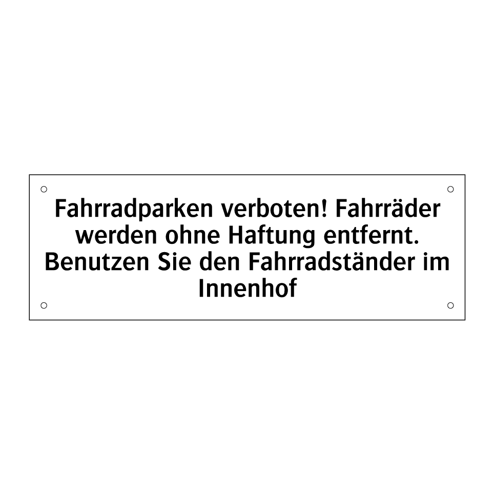 Verbotsschild mit dem Text Fahrradparken verboten! Fahrräder werden ohne Haftung entfernt. Benutzen Sie den Fahrradständer im Innenhof