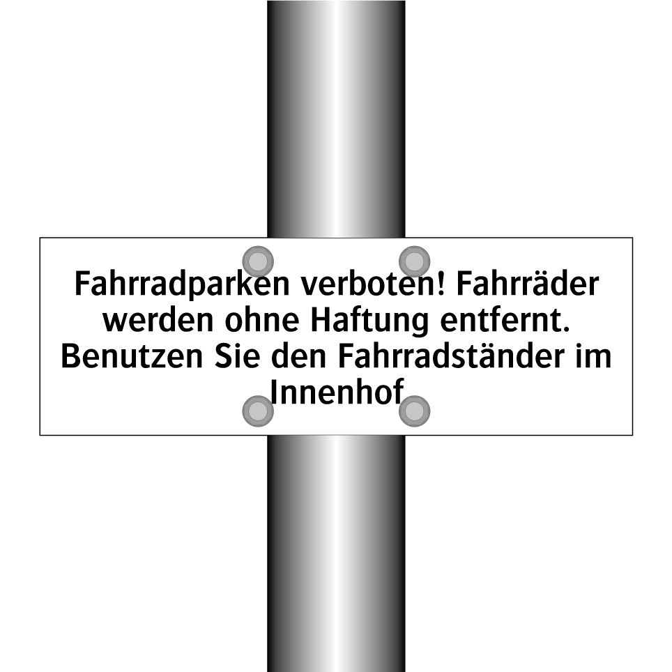 Diese Verbotsschild ist ideal, um unerwünschtes Abstellen von Fahrrädern zu verhindern. Sie eignet sich hervorragend für Eingangsbereiche, Parkplätze oder andere Orte, an denen das Abstellen von Fahrrädern nicht gestattet ist. Durch die klare Botschaft wird darauf hingewiesen, dass Fahrräder ohne Haftung entfernt werden können, was die Einhaltung der Regeln fördert. Die Anweisung, den Fahrradständer im Innenhof zu nutzen, lenkt die Radfahrer zu einem geeigneten Abstellplatz. Diese Schilder sind besonders nützlich in Wohnanlagen, Bürogebäuden oder öffentlichen Einrichtungen, um Ordnung und Sicherheit zu gewährleisten.