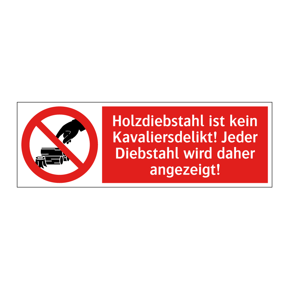 Verbotsschild mit dem Text Holzdiebstahl ist kein Kavaliersdelikt! Jeder Diebstahl wird daher angezeigt!