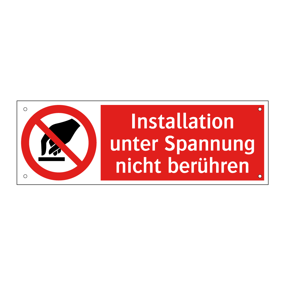 Verbotsschild mit dem Text Installation unter Spannung nicht berühren