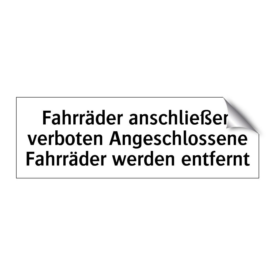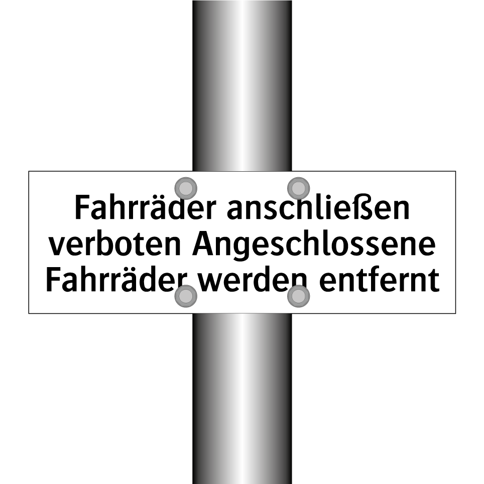 Verbotsschild mit dem Text Fahrräder anschließen verboten Angeschlossene Fahrräder werden entfernt