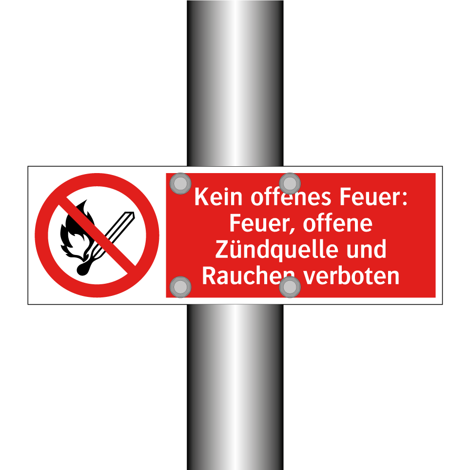 Verbotsschild mit dem Text Kein offenes Feuer: Feuer, offene Zündquelle und Rauchen verboten