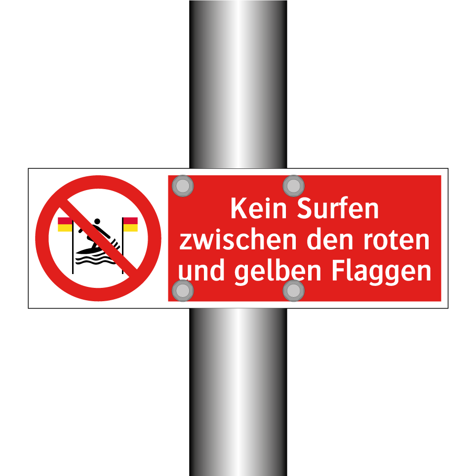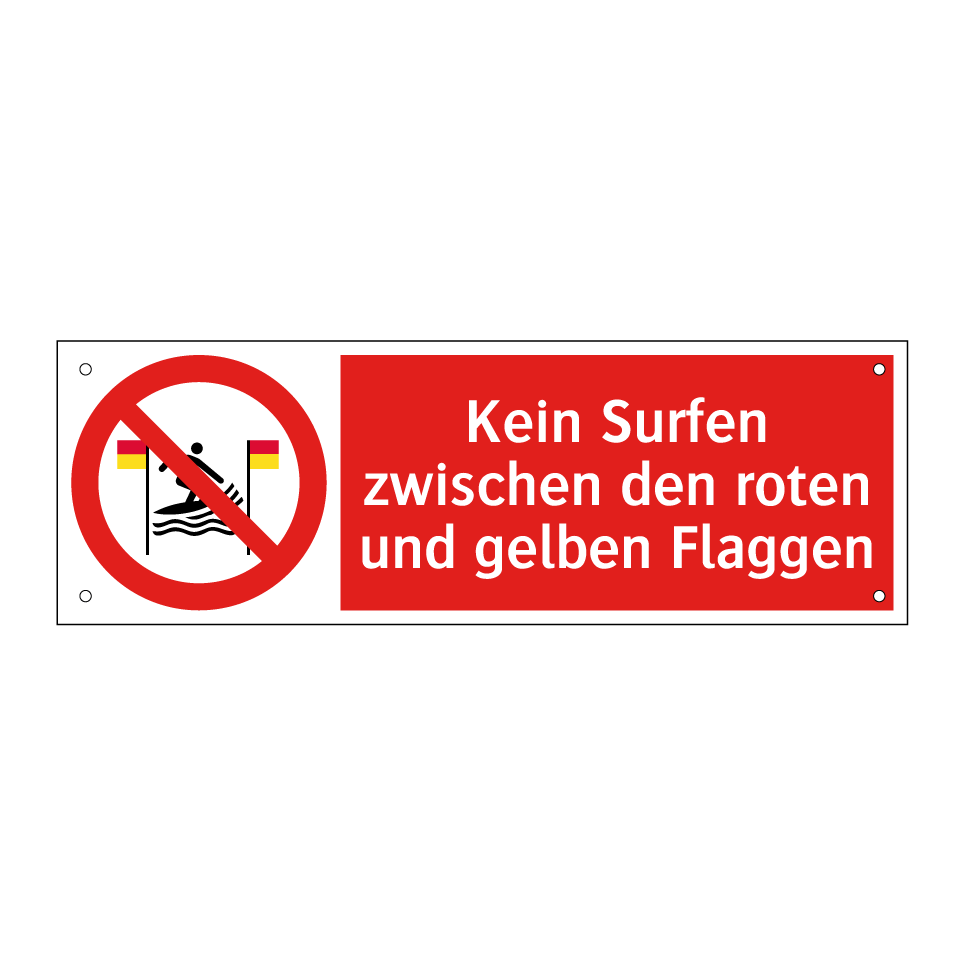 Verbotsschild mit dem Text Kein Surfen zwischen den roten und gelben Flaggen