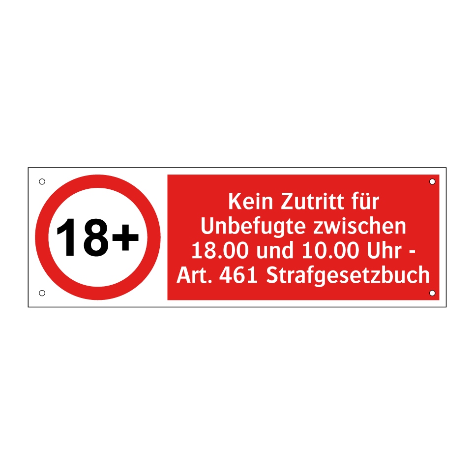 Verbotsschild mit dem Text Kein Zutritt für Unbefugte zwischen 18.00 und 10.00 Uhr - Art. 461 Strafgesetzbuch