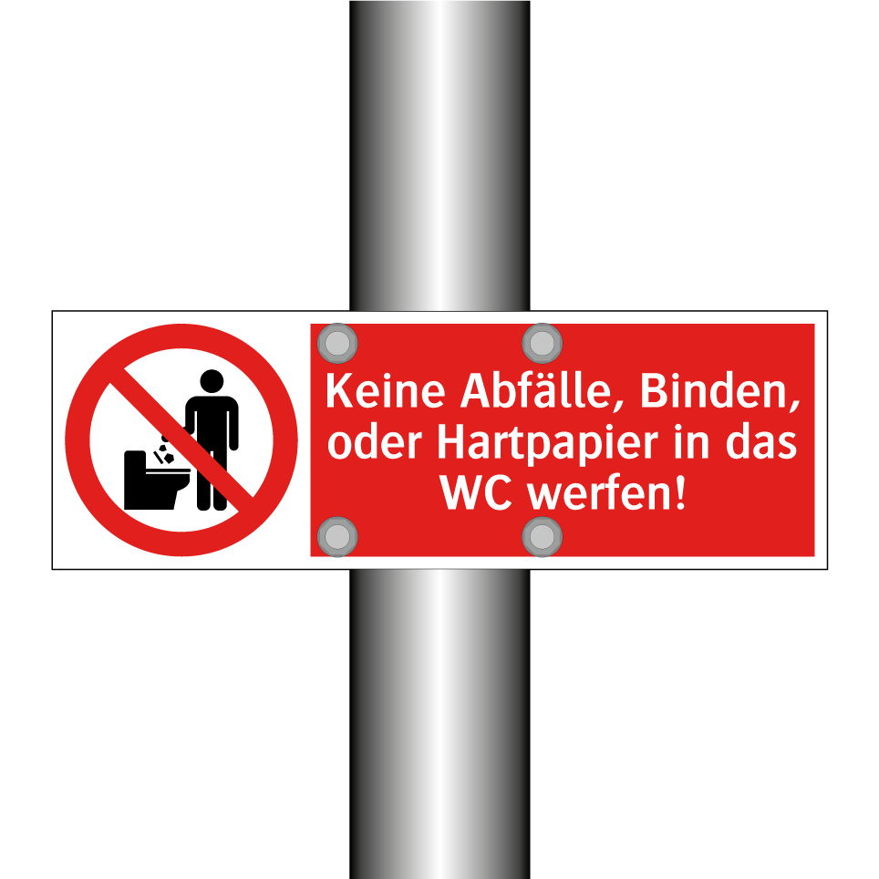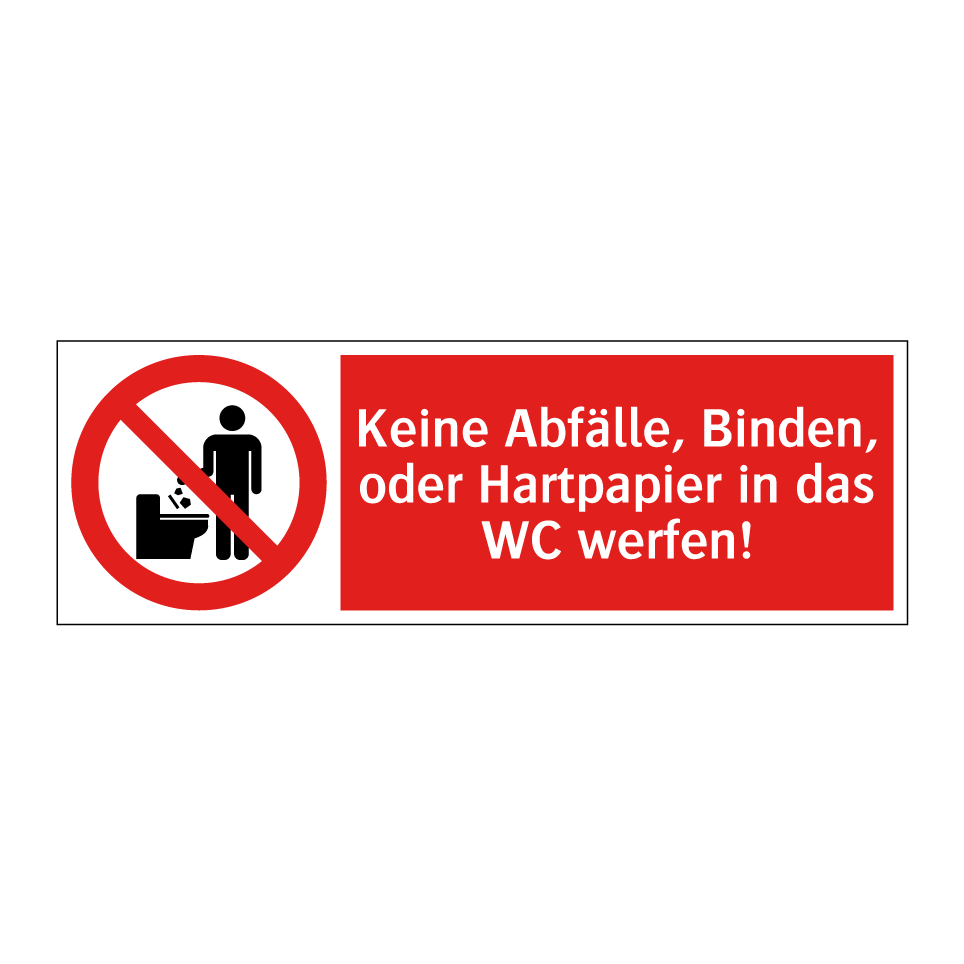 Verbotsschild mit dem Text Keine Abfälle, Binden, oder Hartpapier in das WC werfen!