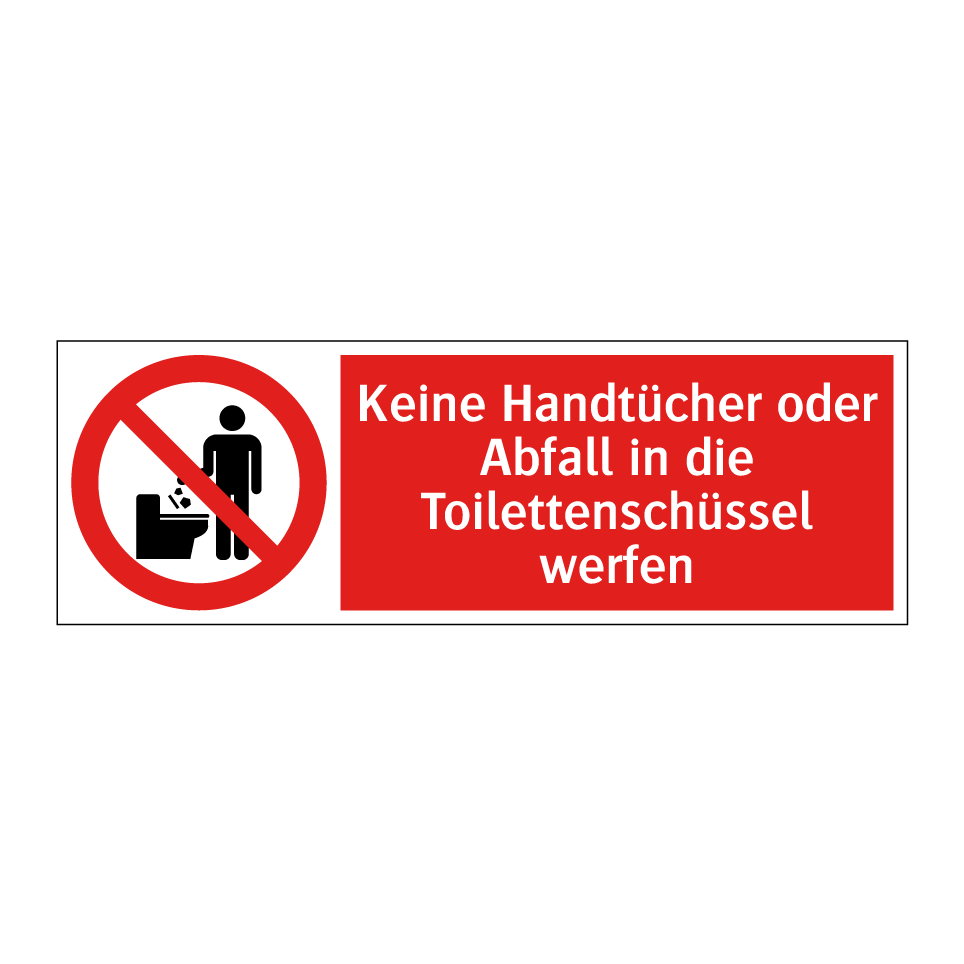 Verbotsschild mit dem Text Keine Handtücher oder Abfall in die Toilettenschüssel werfen