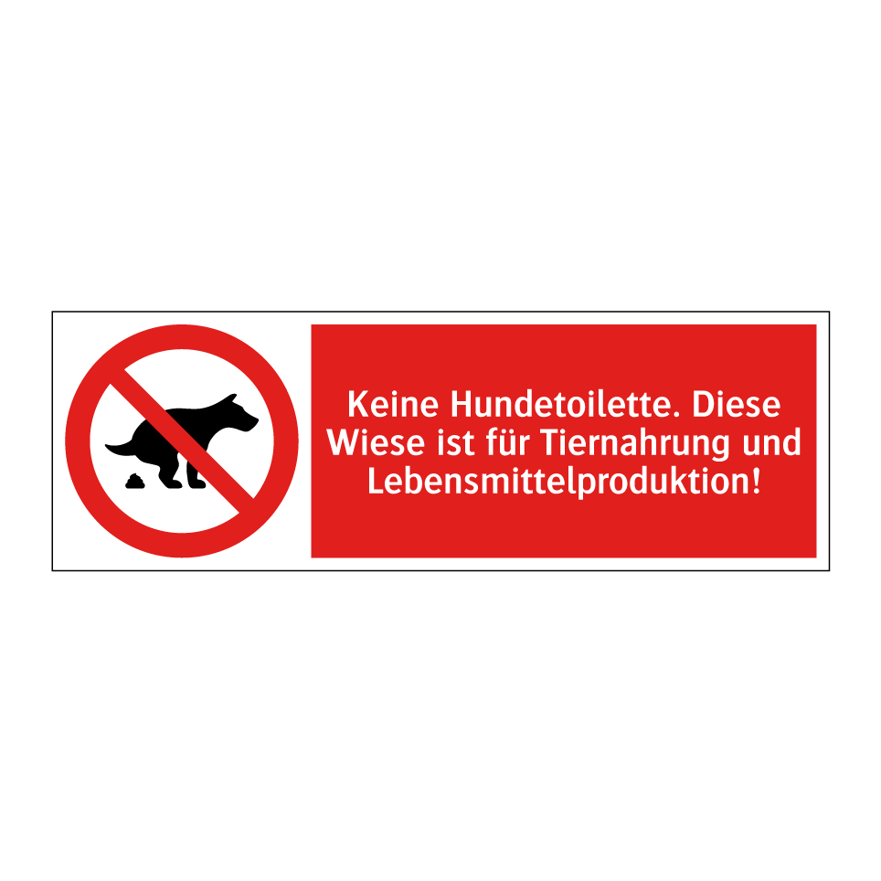 Verbotsschild mit dem Text Keine Hundetoilette. Diese Wiese ist für Tiernahrung und Lebensmittelproduktion!