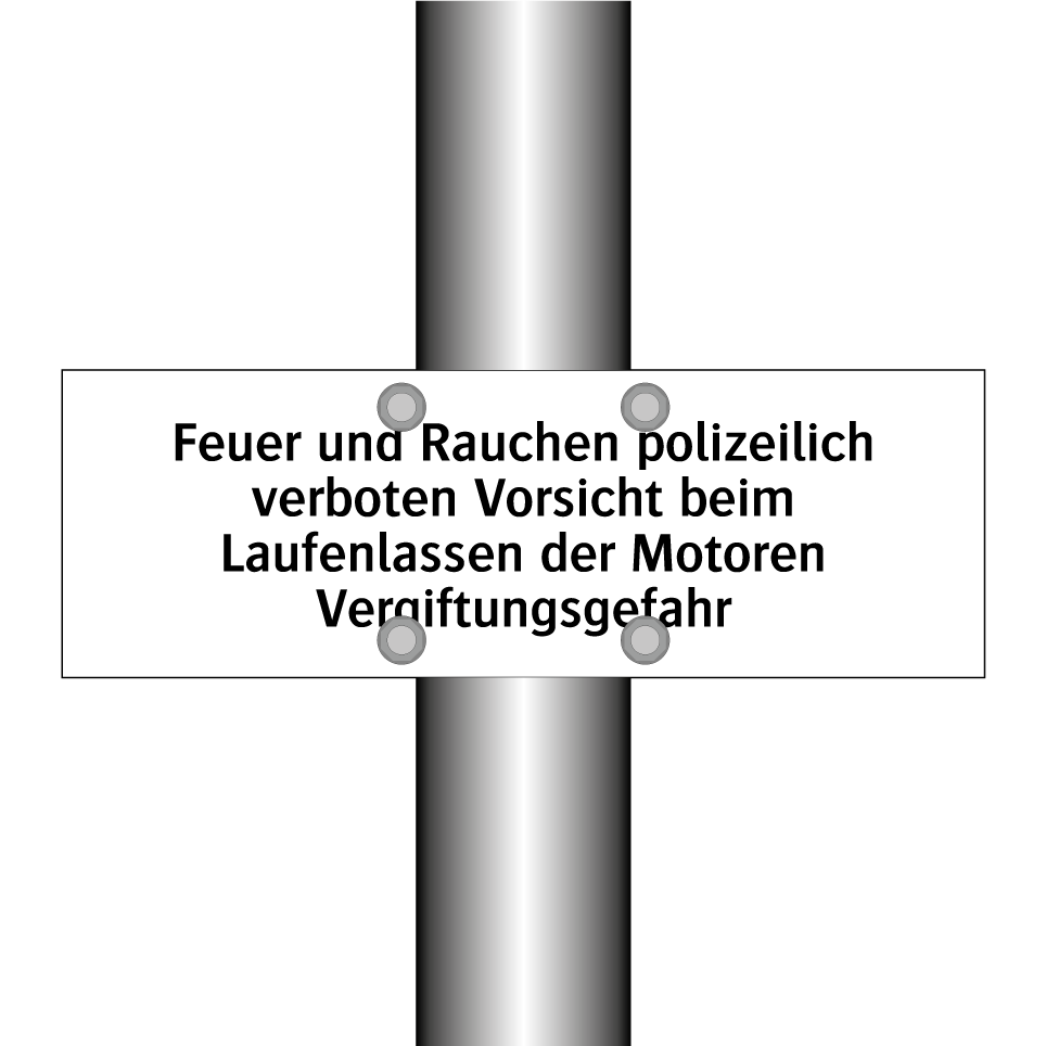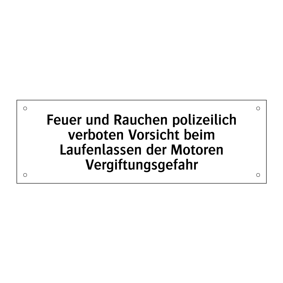 Verbotsschild mit dem Text Feuer und Rauchen polizeilich verboten Vorsicht beim Laufenlassen der Motoren Vergiftungsgefahr