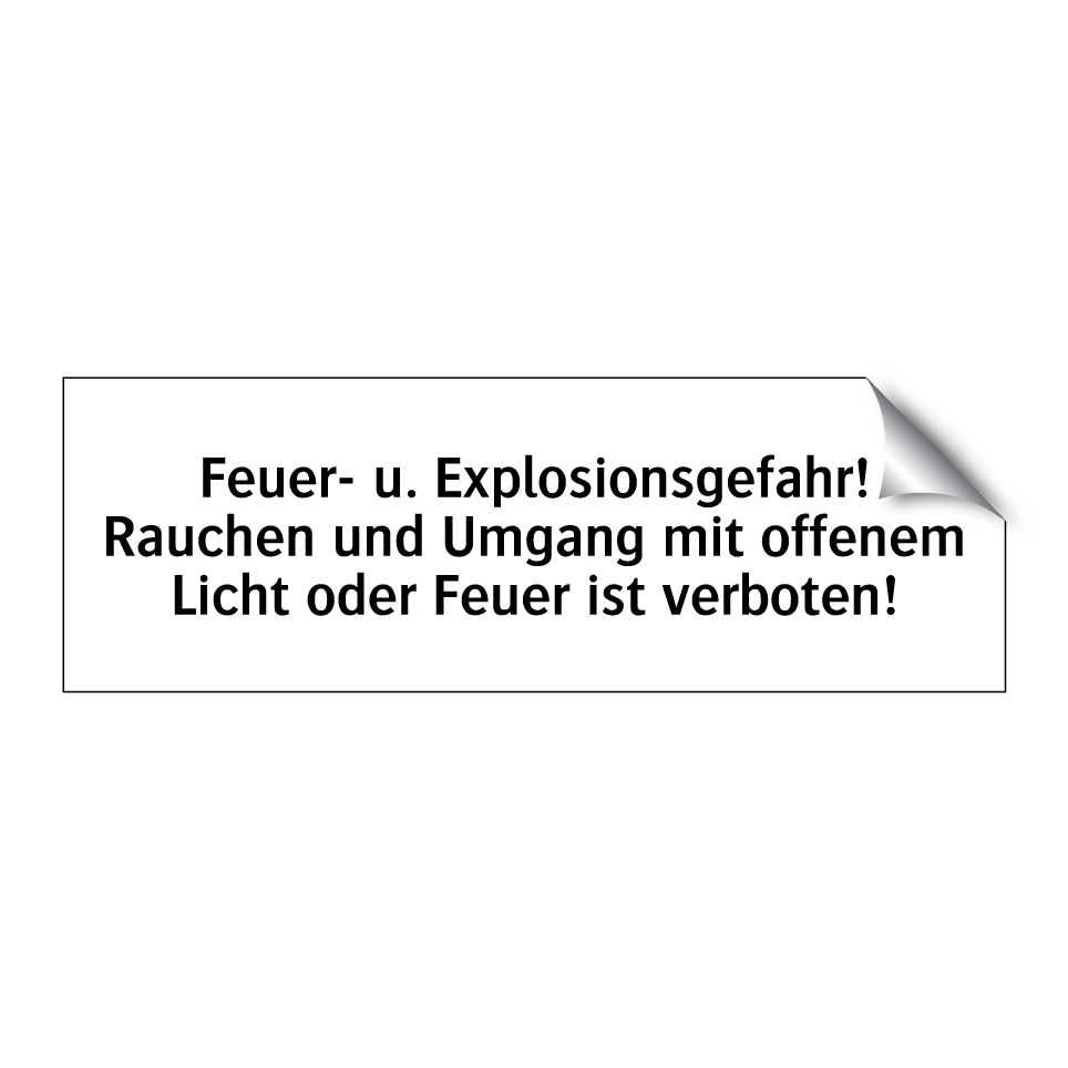 Verbotsschild mit dem Text Feuer- u. Explosionsgefahr! Rauchen und Umgang mit offenem Licht oder Feuer ist verboten!